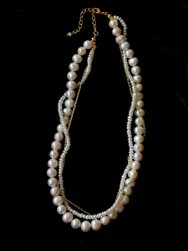 This multi-wrap pearl necklace features a refined combination of small pearls, larger pearls, and delicate gold-tone chains, creating depth without visual clutter.