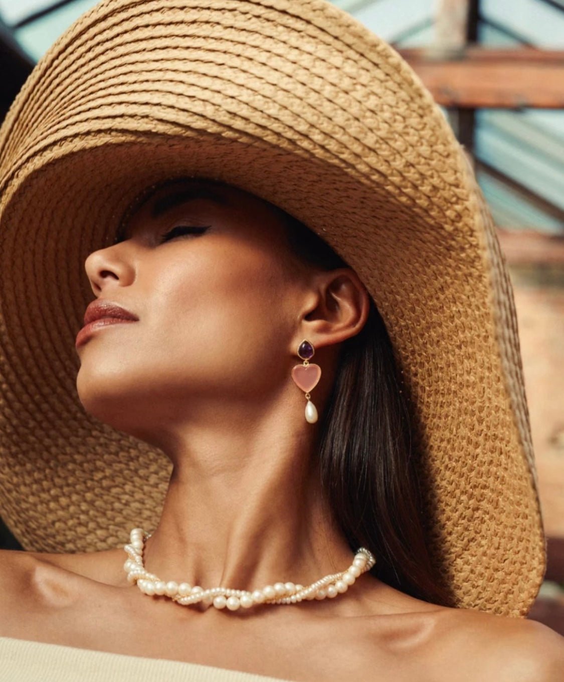 The three-layer wrapped design naturally follows the neckline, enhancing the collarbone and neck line with an elegant, sculptural silhouette.