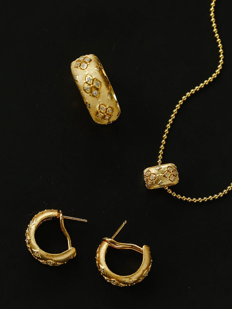 Inspired by century-old Italian court jewelry, this necklace revives the art of hand-brushed gold craftsmanship. Made of 925 sterling silver with intricate brushed textures and sparkling zircon clover motifs, it exudes quiet luxury. The flowing roller bead chain shines like liquid gold, elongating the neckline with effortless elegance. Perfect for layering or wearing solo with fall and winter knits.