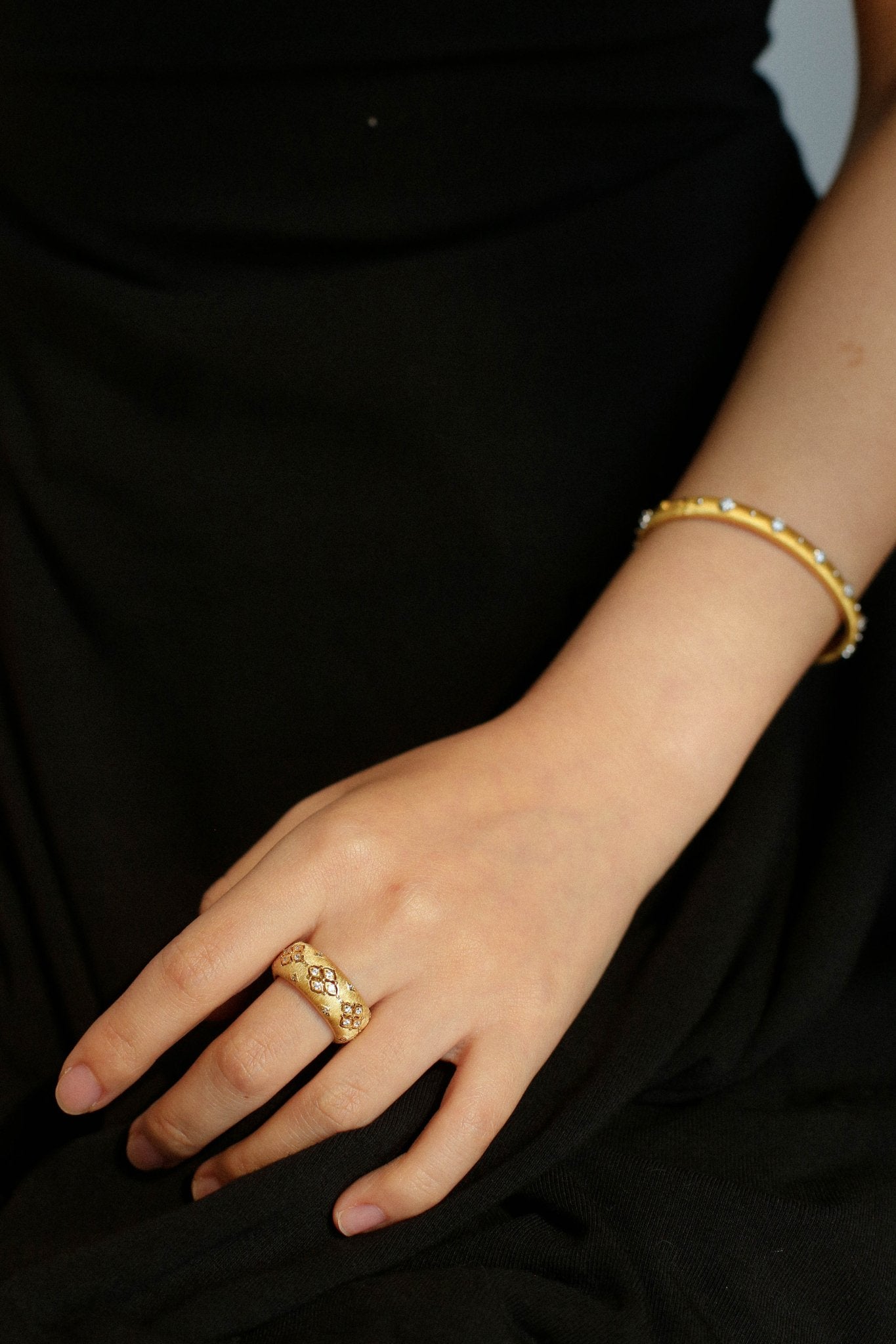 A statement of classic artistry and strength. This wide-band ring is made of 925 sterling silver with hand-brushed detailing and a zircon-embedded four-leaf clover center. The textured finish captures the glow of Tuscany’s evening sky — refined, romantic, and endlessly charming. A perfect piece to elevate any look with vintage grandeur.