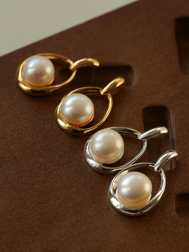 At the center sits a naturally luminous freshwater pearl, round and full with a soft, radiant glow. The minimal metal frame delicately cradles the pearl, striking a perfect balance between simplicity and sculptural design.