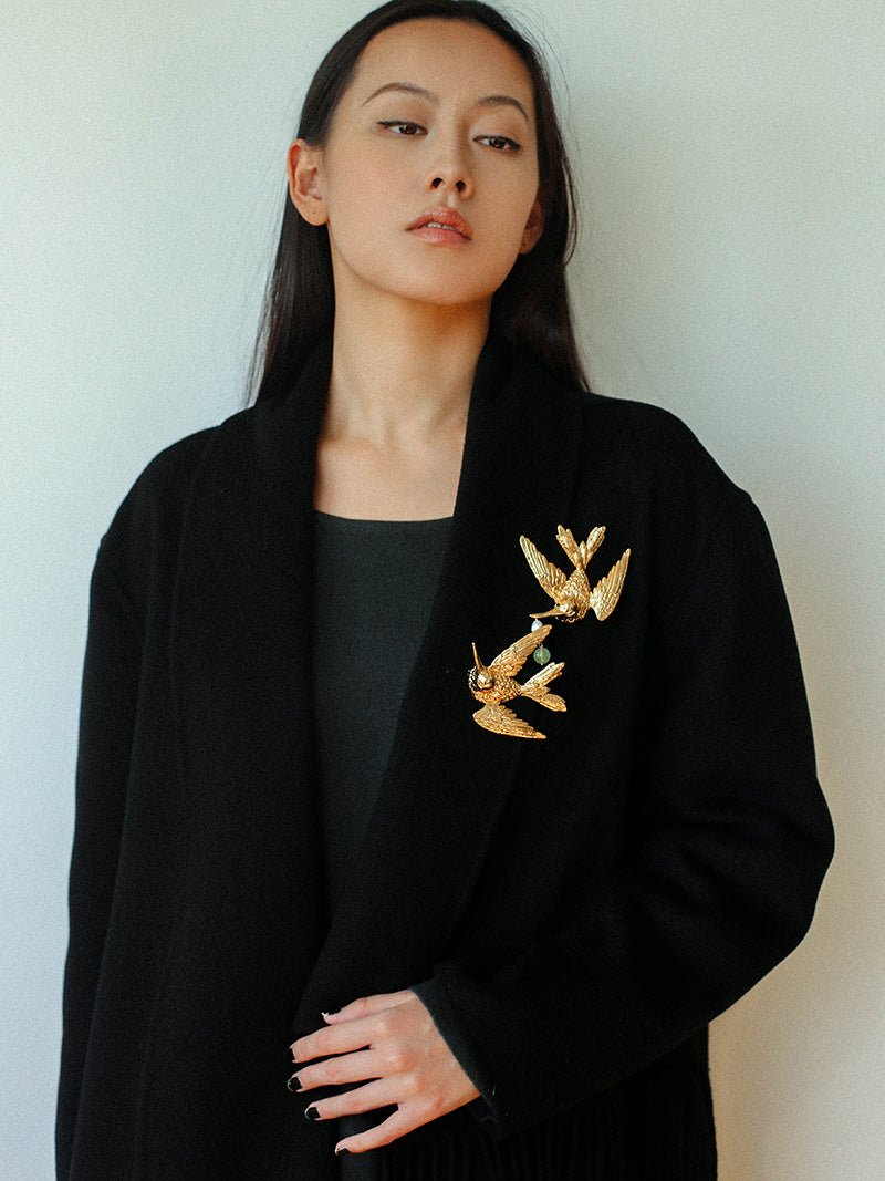 A high-fashion vintage–inspired hummingbird brooch with a dramatic 7cm wingspan. Crafted in 18K gold-plated brass, each feather is individually carved in layered detail—right down to the subtle curvature of the beak. Under sunlight, the piece appears almost lifelike, as if a real hummingbird is frozen in midair.
