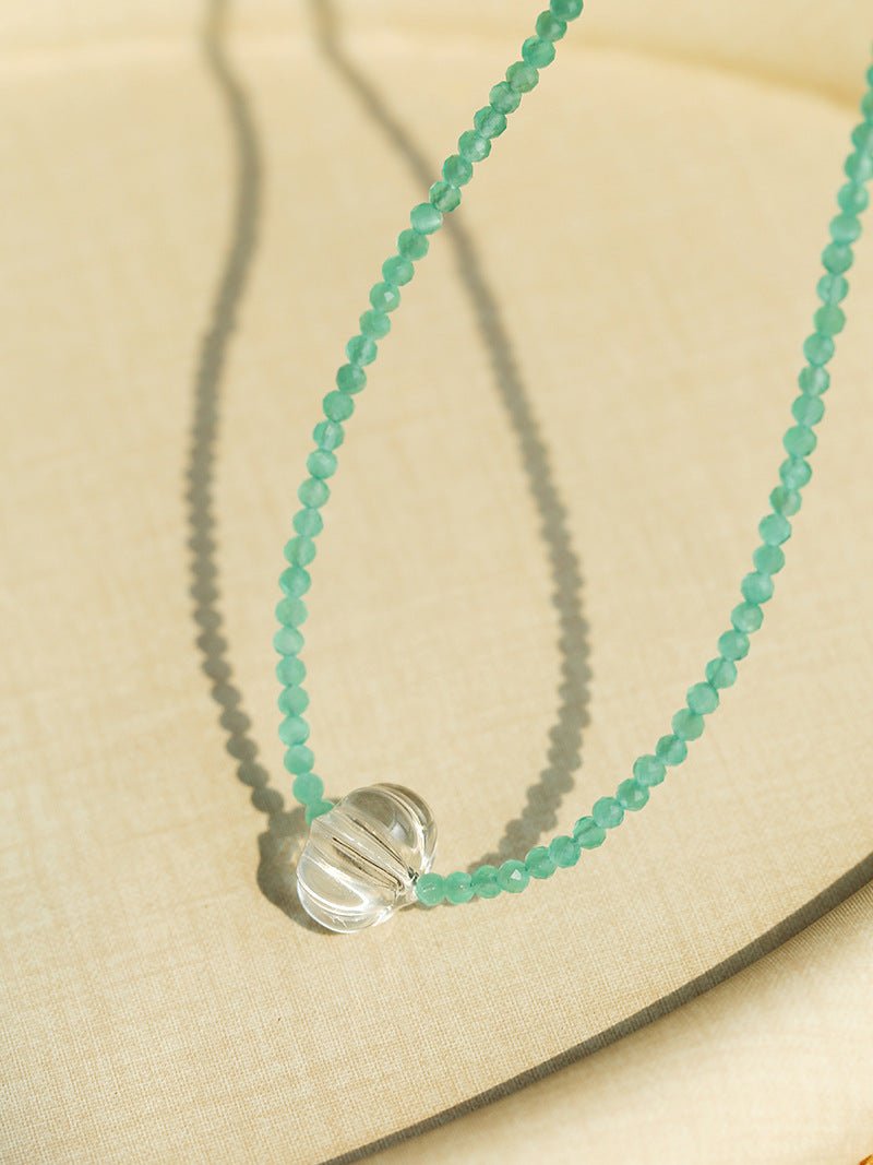 A fresh and summery choker perfect for a breezy, boho-chic look. Crafted with tiny 3mm mint green glass beads, centered with a hand-carved clear glass pumpkin bead for a playful, textured detail. Lightweight and comfortable, ideal for daily wear, beach outings, or layering with other necklaces for a layered summer style.