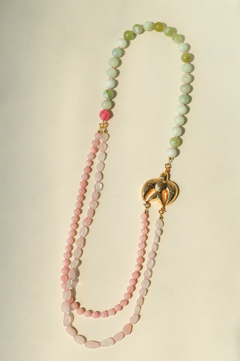 Inspired by the graceful silhouette of doves and swallows, this original piece symbolizes freedom, peace, and hope. Soft macaron-pink crystals are paired with refreshing pastel gemstones, creating a dreamy color palette perfect for the season. A delicate gold bird charm adds movement and artistic charm, elevating the design with a touch of sophistication.