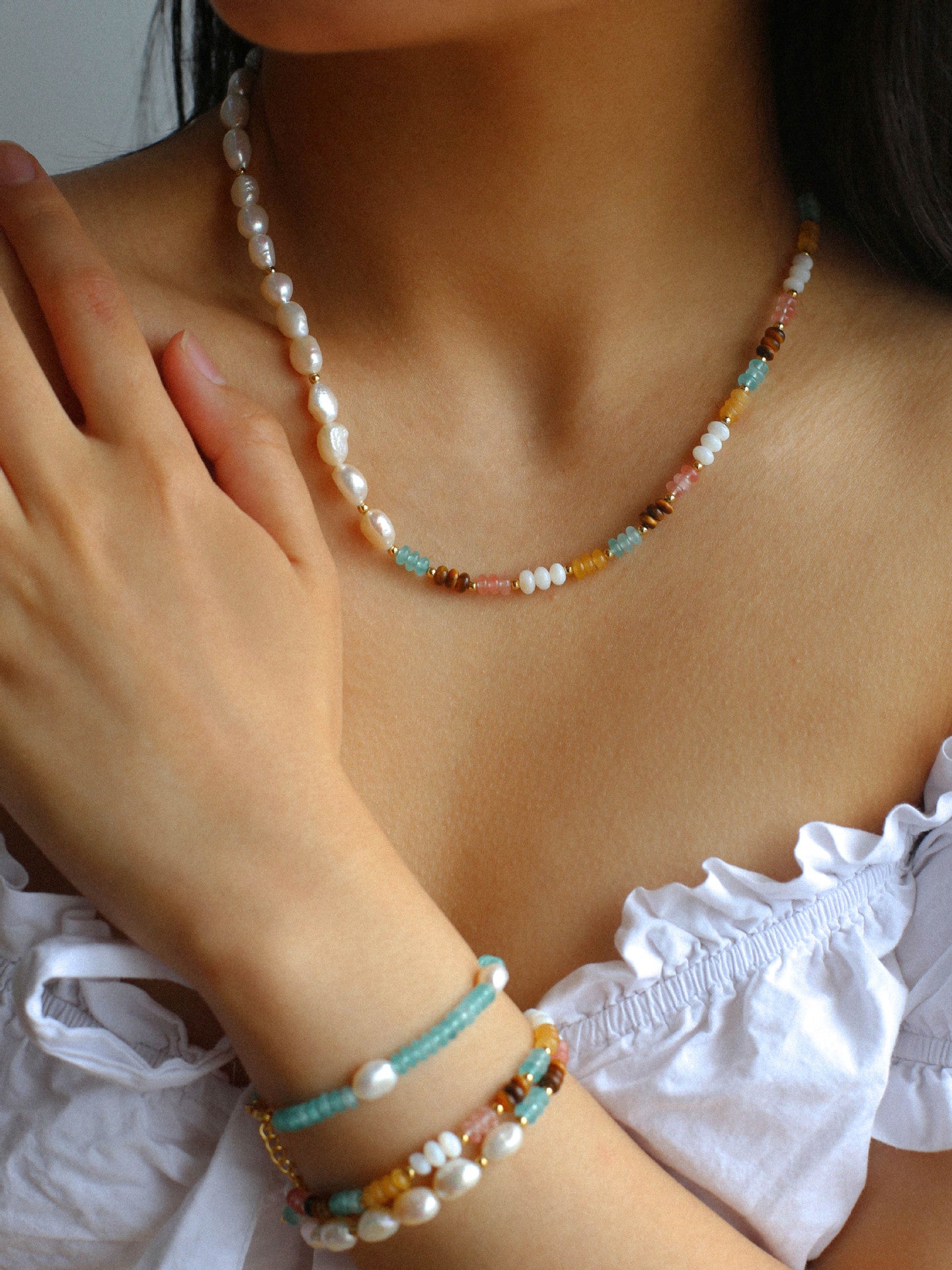Introducing our "Colorful Natural Stone Stacked Beads Bracelet" collection, featuring three captivating variants that effortlessly blend freshwater pearls with natural stones. Each bracelet is carefully handcrafted to ensure quality and comfort, offering a delightful combination of natural elements. Elevate your style with this harmonious marriage of nature's finest treasures.