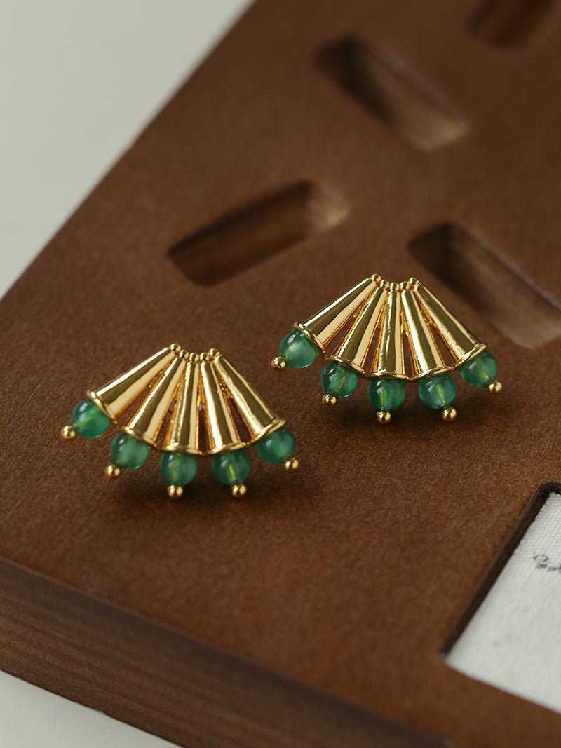 These stud earrings feature a vintage fan-shaped design with a polished metal finish that shines with sophistication. The edges are adorned with delicate faux pearls and red & green agate stones, adding depth and elegance to your look. Perfect for everyday wear or slightly formal occasions, they effortlessly elevate your style with a touch of refined charm 💫