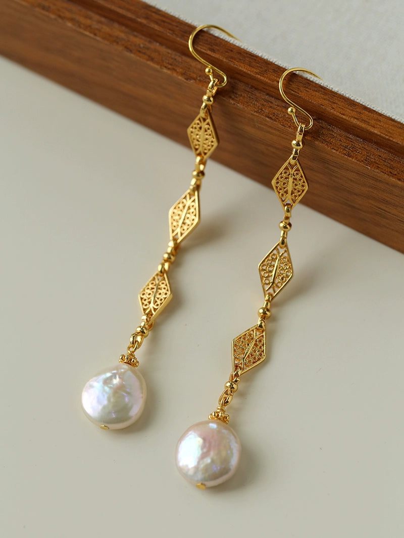 Inspired by French classical elegance, these earrings feature gold-plated openwork diamond-shaped frames that echo the intricate beauty of medieval cathedral stained-glass windows. Suspended natural Baroque pearls sway delicately with every movement, each one uniquely irregular, offering a luxurious, one-of-a-kind shimmer.