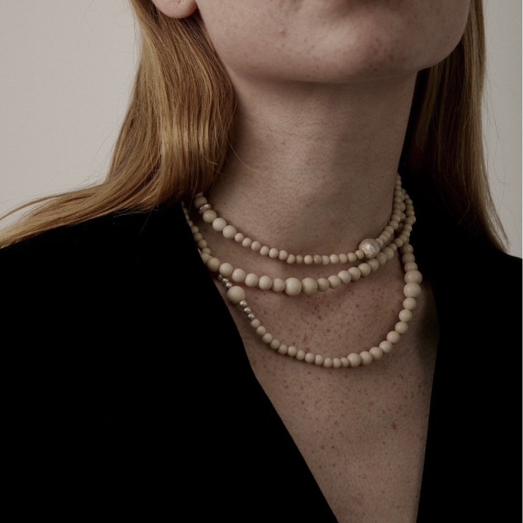 Gradient White Fossil and Silver Bead Long Beaded OT Clasp Necklace