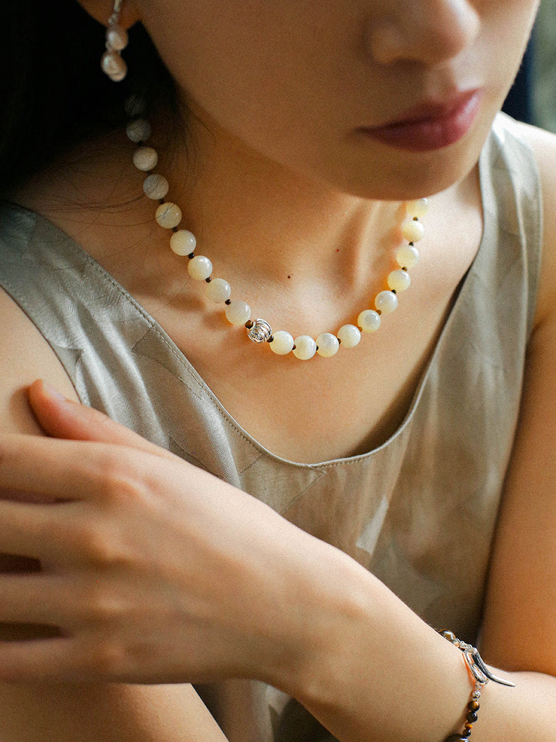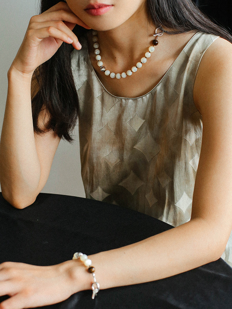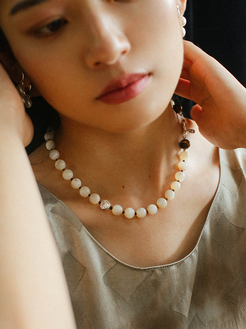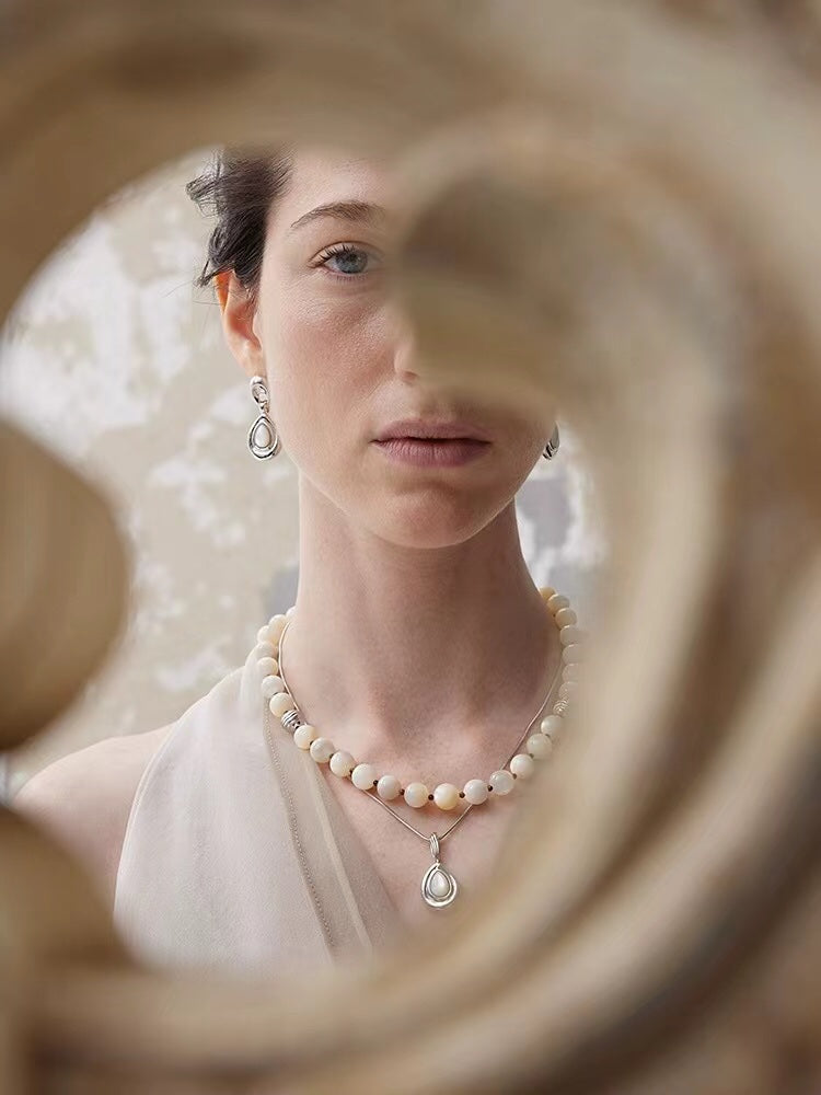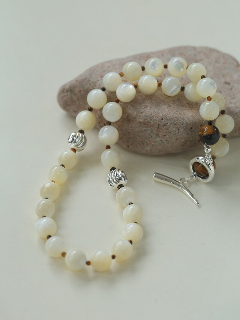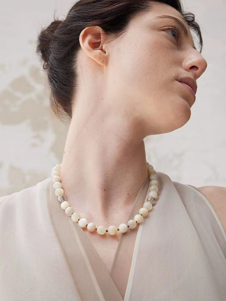 Smooth Mother of Pearls and Silver Shell Beaded OT Necklace