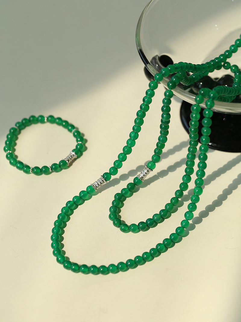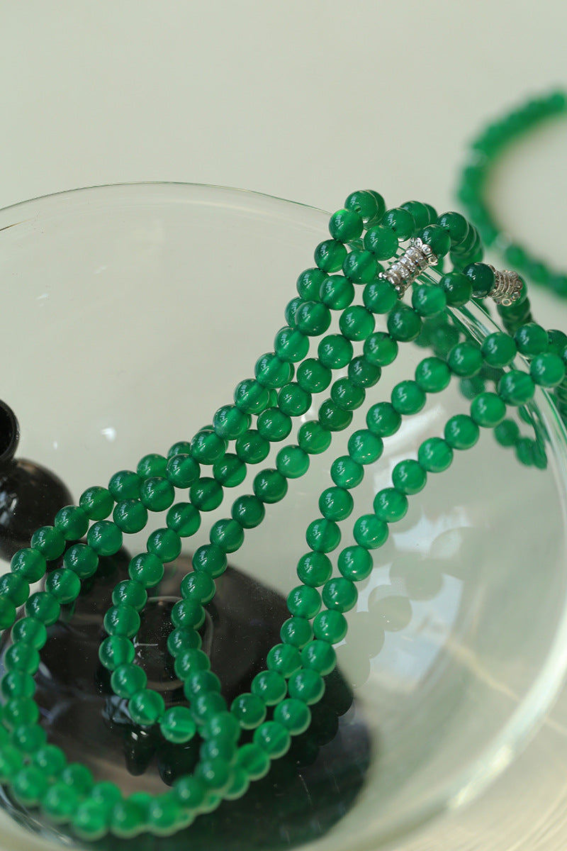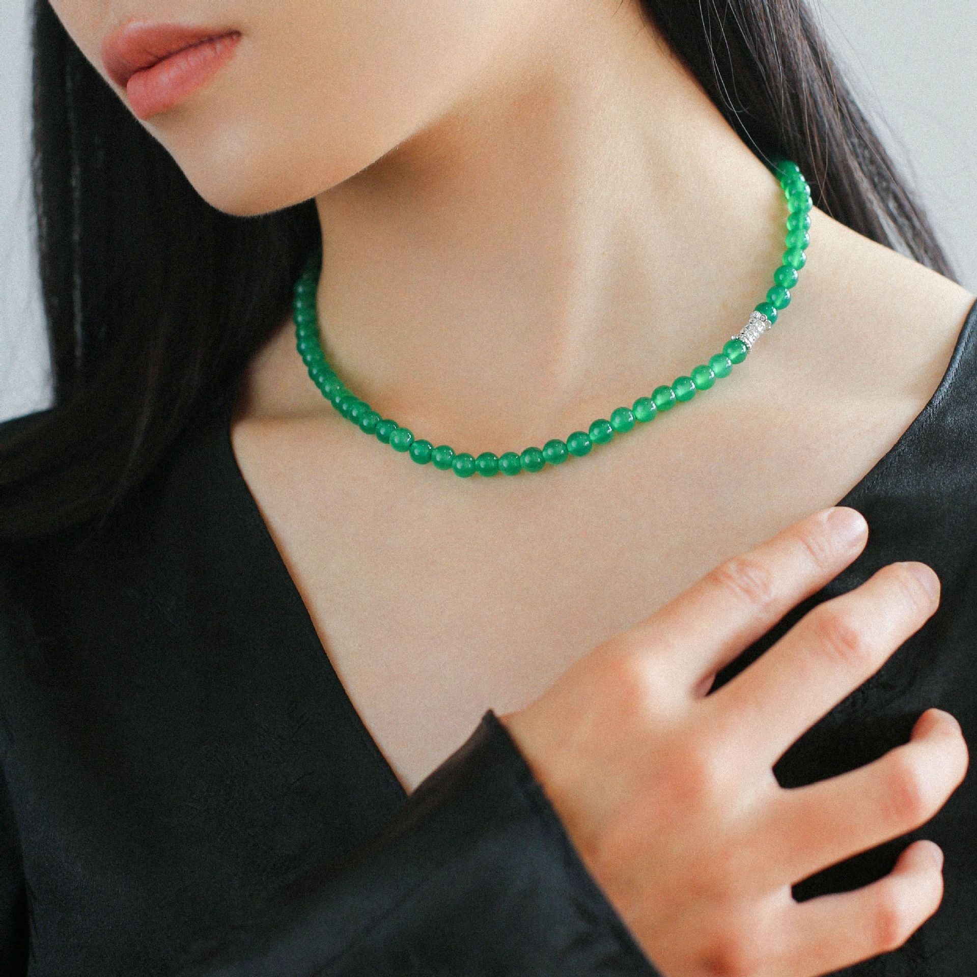 This elastic necklace combines traditional Chinese aesthetic elements with modern style. Featuring sparkling zirconia beads and soothing green agate beads, this necklace exudes elegance and sophistication. The intricate bead arrangement creates a harmonious balance between vintage charm and modern style.