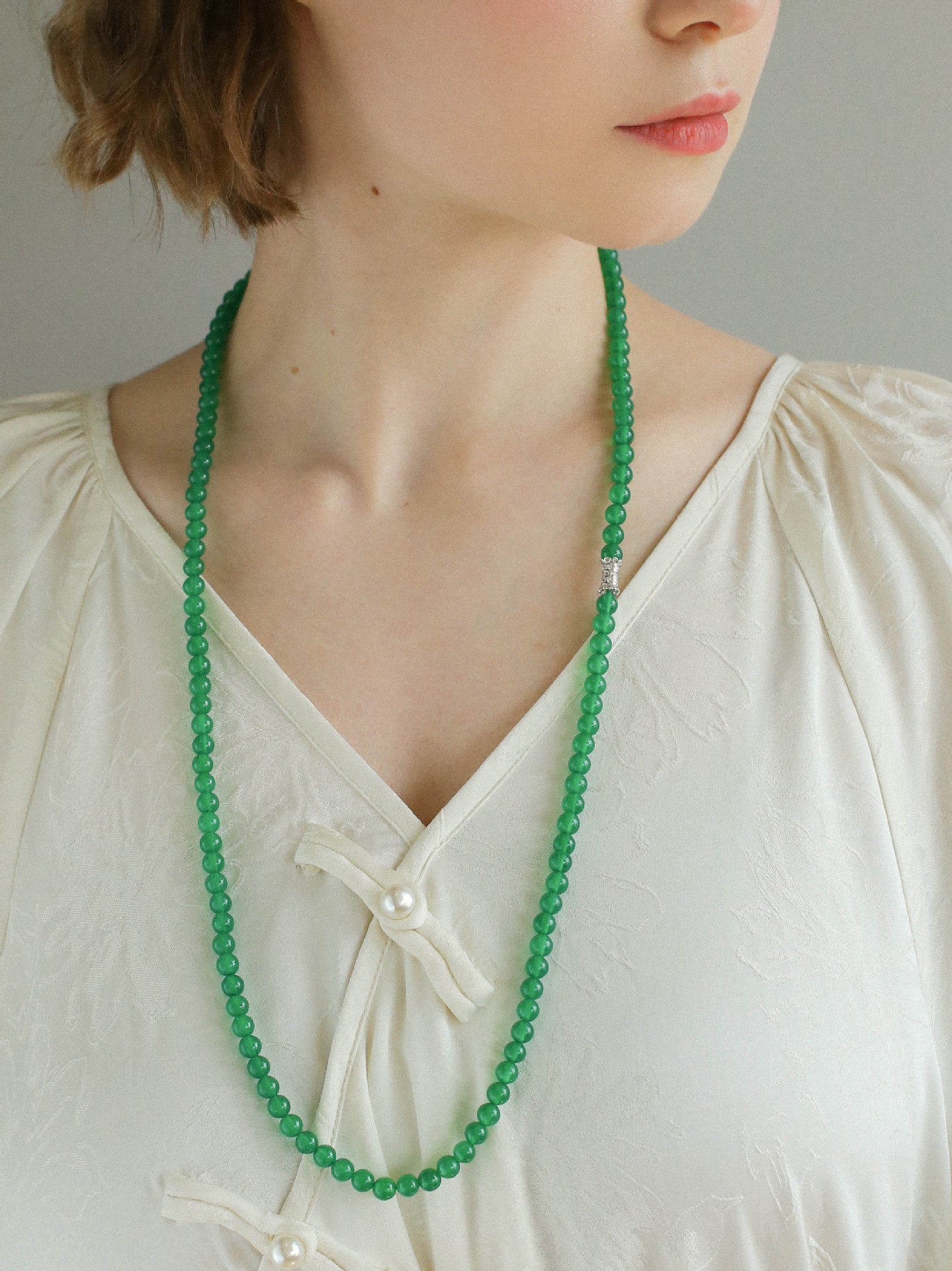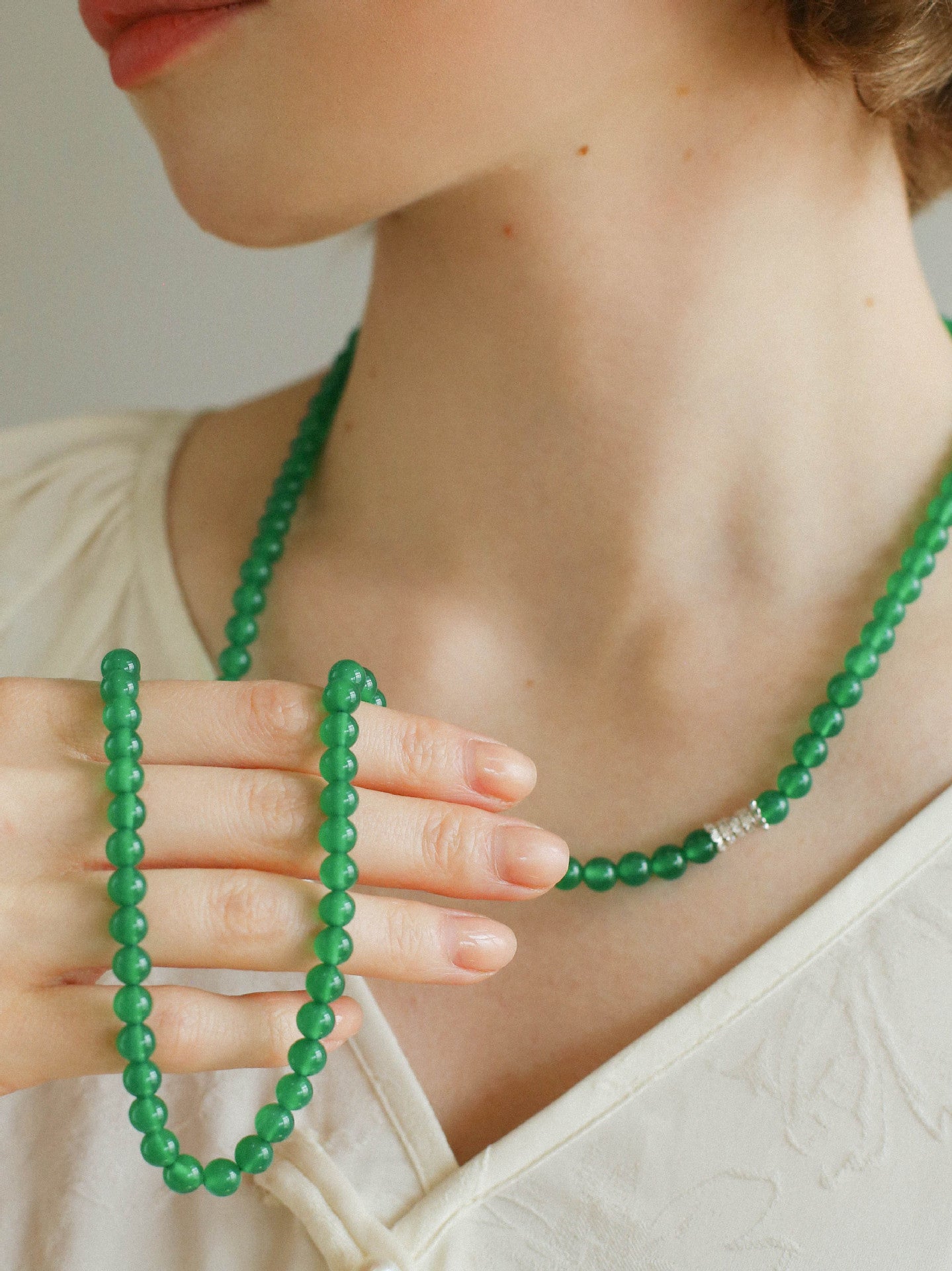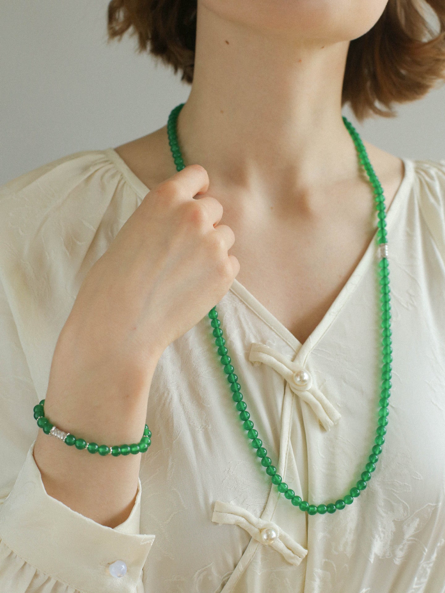 This elastic necklace combines traditional Chinese aesthetic elements with modern style. Featuring sparkling zirconia beads and soothing green agate beads, this necklace exudes elegance and sophistication. The intricate bead arrangement creates a harmonious balance between vintage charm and modern style.