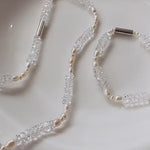 This delicate necklace features natural white crystal beads that are carefully cut and carved into the shape of traditional abacus beads. Symbolizing clarity, balance and precision, this necklace combines the natural beauty of white crystal with the cultural significance of the abacus.