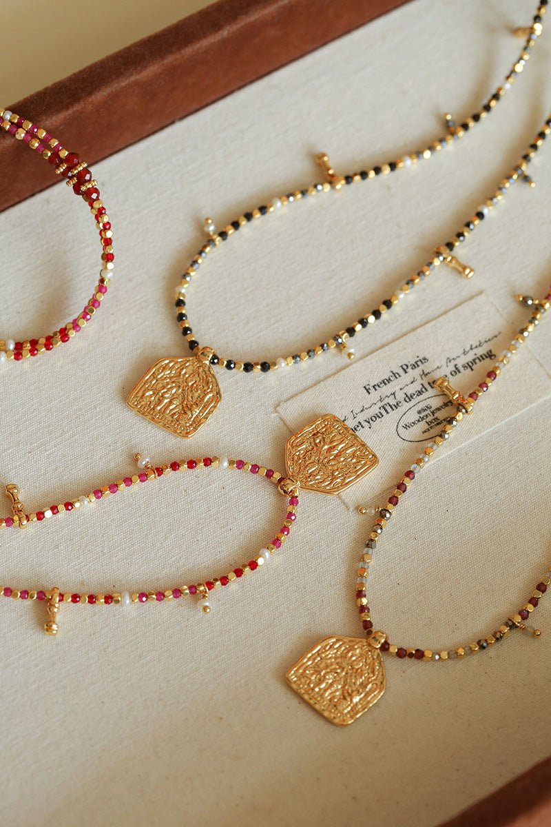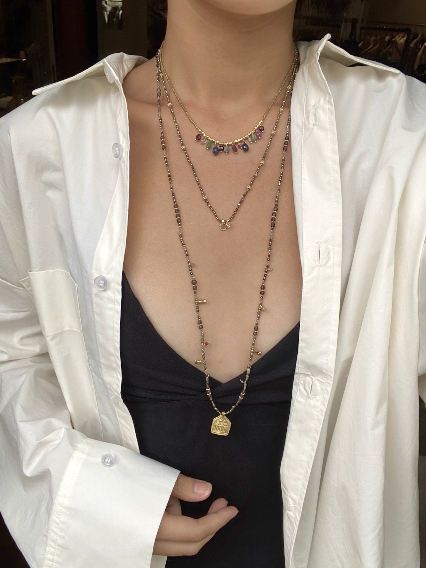 This colorful mini natural stone necklace blends three vibrant stone tones with golden accents, creating a soft yet layered contrast with a relaxed bohemian vibe ✨