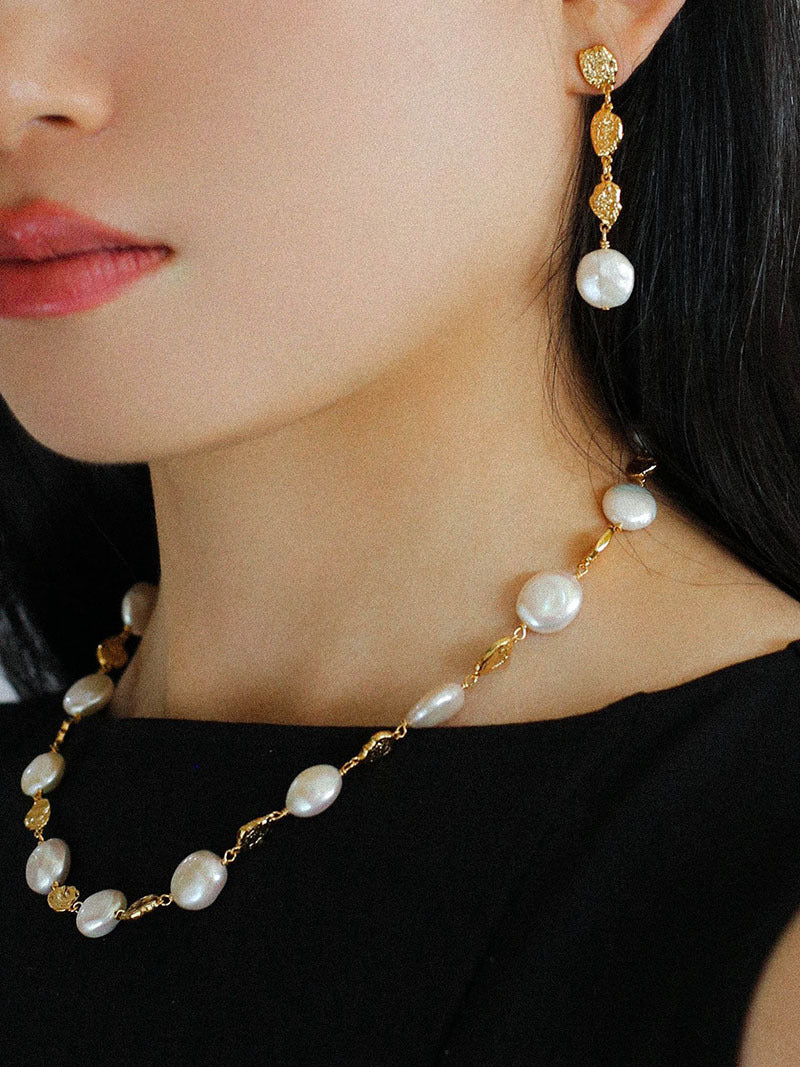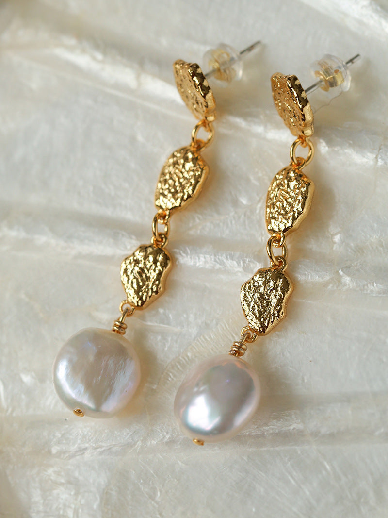 Gold Lava Coin Baroque Pearls Drop Earrings in Long
