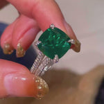 A striking statement piece designed to command attention. This ring features a large emerald centerpiece, framed by a double full-pavé halo that amplifies brilliance and depth from every angle. The bold structure and layered sparkle create a luxurious presence while maintaining refined elegance.