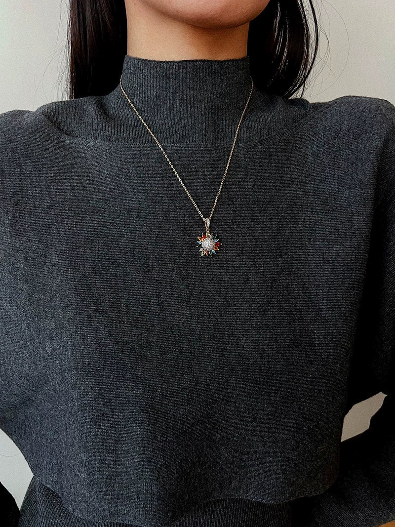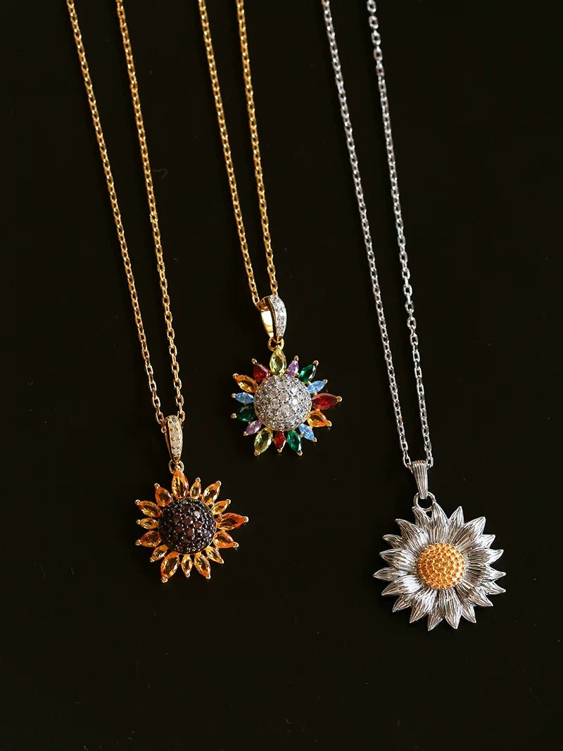 A delicate and colorful sunflower pendant, symbolizing warmth and vitality.Crafted from high-quality 925 sterling silver with 18K gold plating for durability and hypoallergenic comfort.The pendant is adorned with sparkling colored cubic zirconia, adding a lively and refined touch.