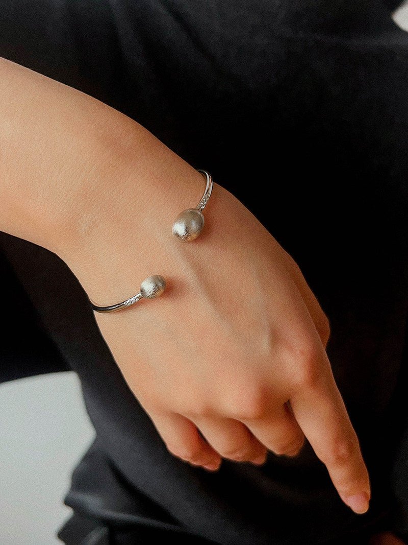 Two asymmetrical brushed silver spheres anchor the design—one bold, one subtle—creating a quiet geometric dialogue that feels modern yet timeless. The soft matte brushing diffuses light beautifully, giving the bangle a calm, understated glow rather than a high-shine statement.