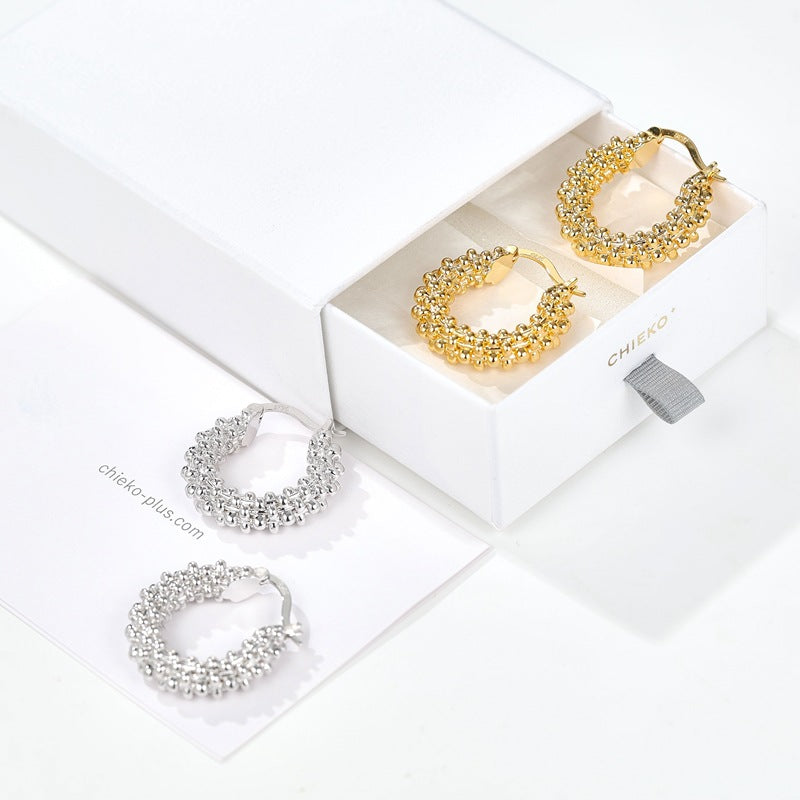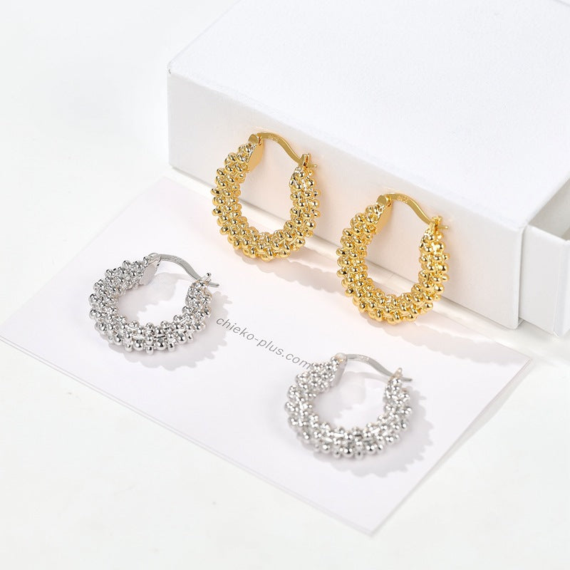 These beaded hoop earrings strike the perfect balance between minimal elegance and modern statement design.The classic circular silhouette is elevated with subtle studded details that catch the light beautifully, adding dimension without overwhelming the look.