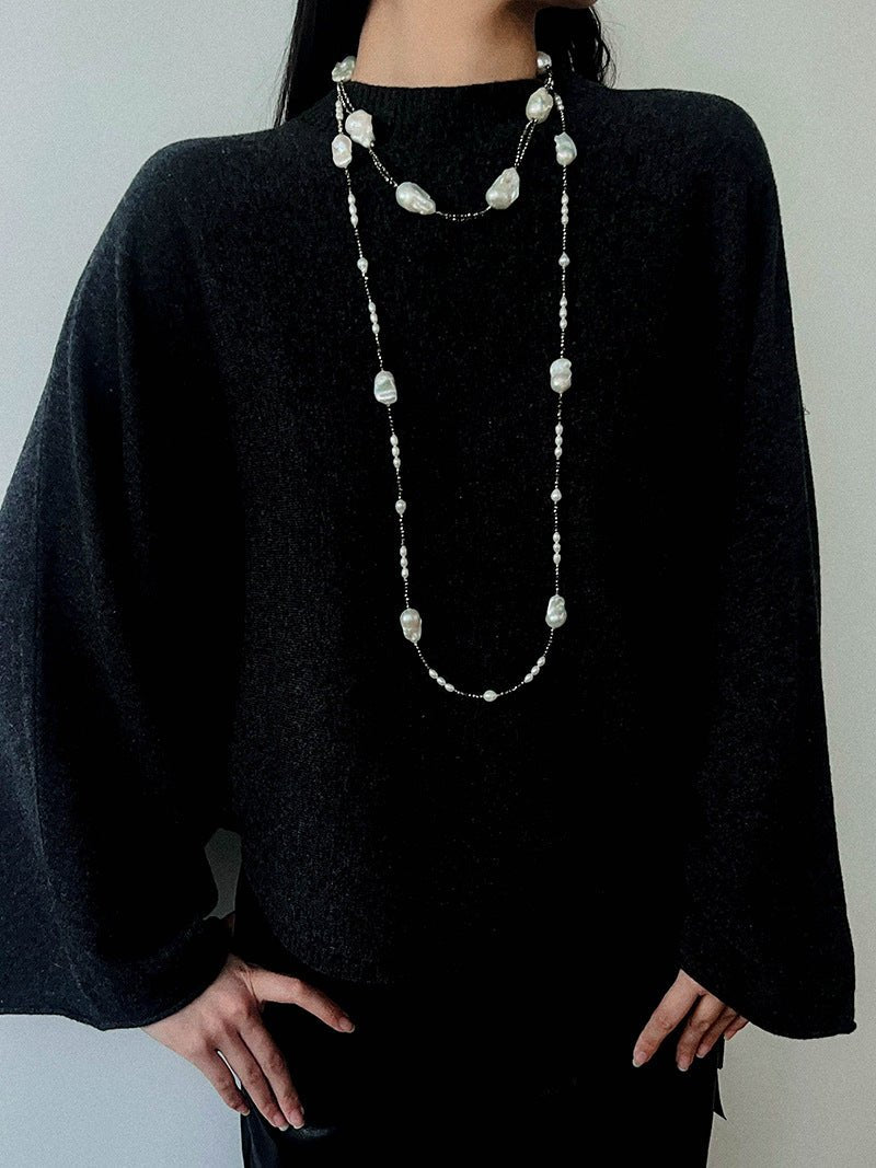 Delicately strung with mini gold ore stones, freshwater pearls, and baroque pearls, the long version features a graceful vertical drop that elongates the neckline and slims the silhouette.