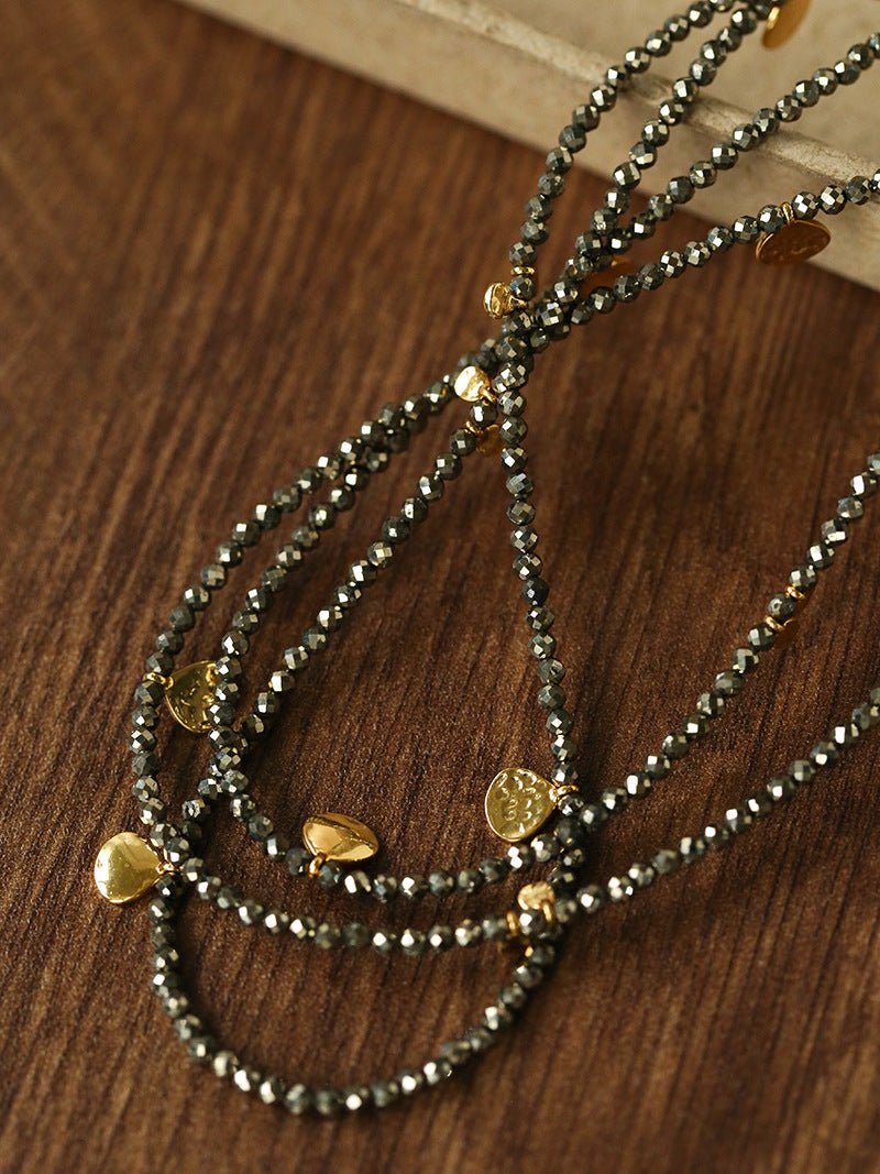 This long necklace features faceted natural pyrite beads that shimmer subtly with a refined metallic glow. Irregular coin accents are spaced throughout, adding movement and an effortless bohemian character without overwhelming the design.