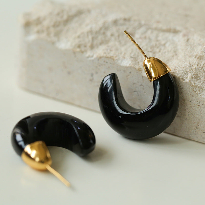 Sterling Silver Moon Shape Huggie Earrings - Tiger Eye Stone / Black Onyx