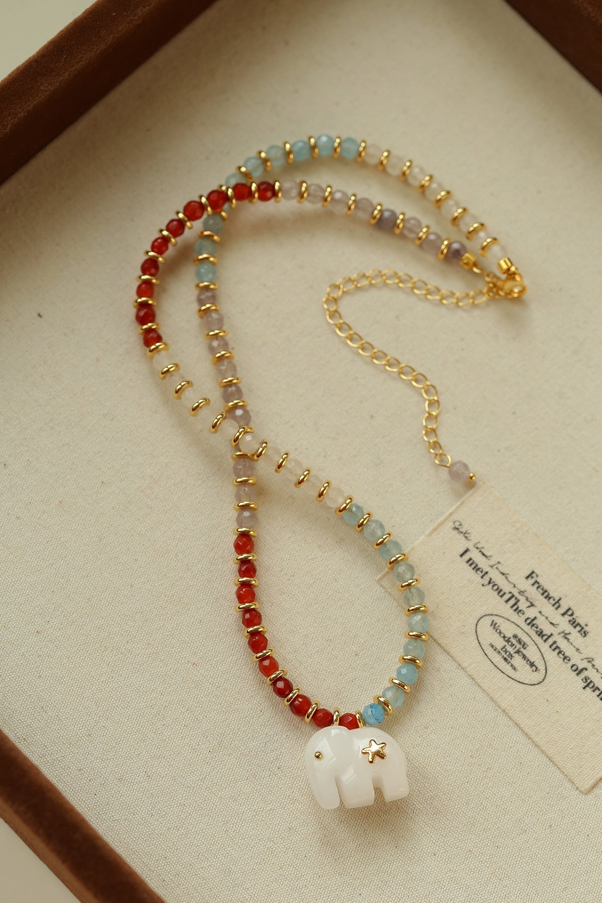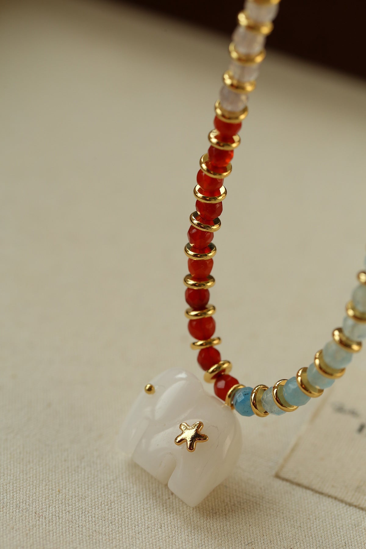 Bohemian Auspicious Elephant Collection Colorful Natural Stone Beads Necklace with White Jade Elephant Pendant