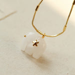 Hand-carved from natural white jade, the elephant pendant symbolizes luck, wisdom, and protection. The smooth texture of jade brings a calm yet powerful presence, beautifully contrasted with 18K gold-plated brass chains.Wear it alone for a minimalist statement or layer it with colorful gemstone necklaces for a true boho-inspired look.