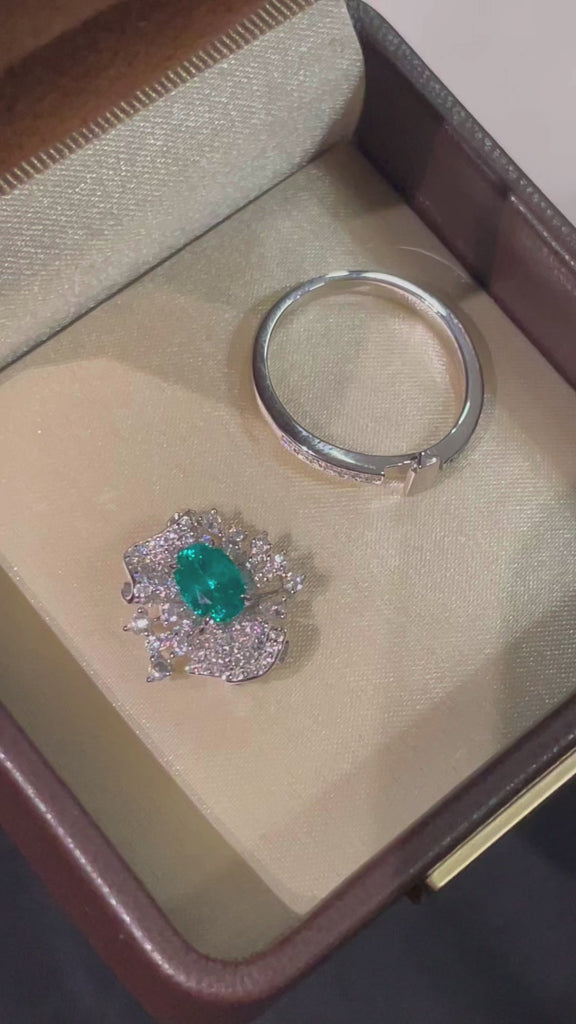 A delicate two-in-one design that transforms effortlessly from a ring to a pendant. Crafted in 925 sterling silver plated with 18K gold, this elegant piece features a hand-selected lab-created Paraiba gemstone — luminous, vibrant, and full of tropical charm. Its floral silhouette adds a touch of refined femininity, perfect for both everyday wear and special occasions. Available in US sizes 6, 7, and 8.