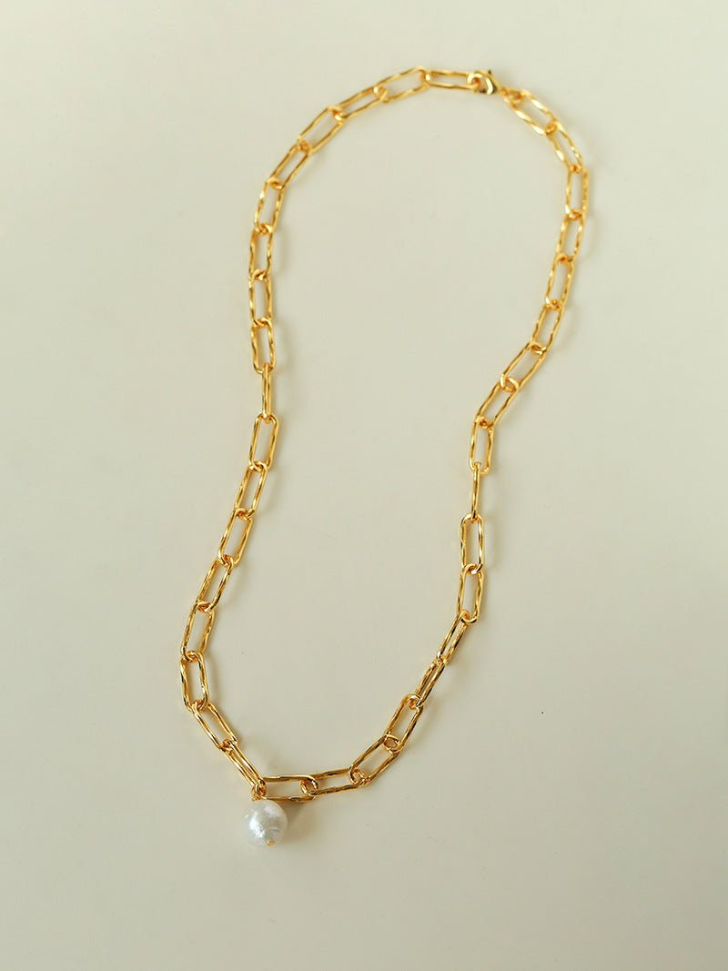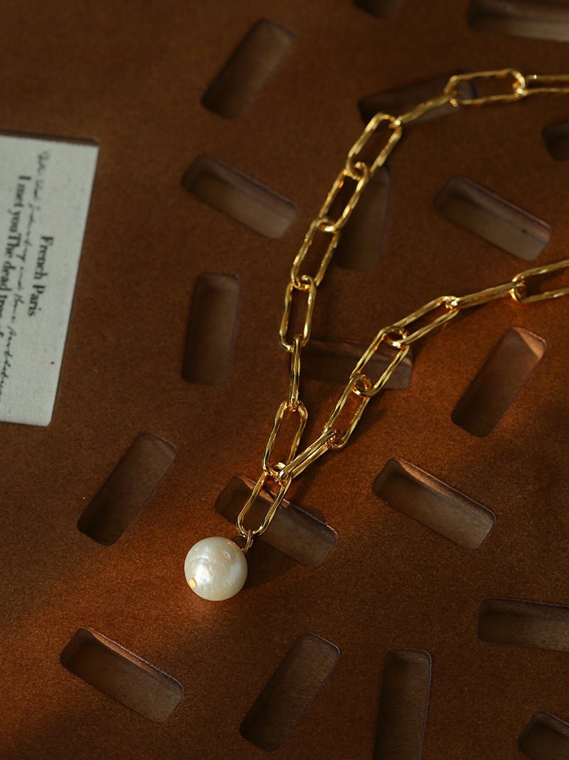 This necklace combines a bold gold-tone toggle chain with a natural baroque pearl for a clean yet confident look.