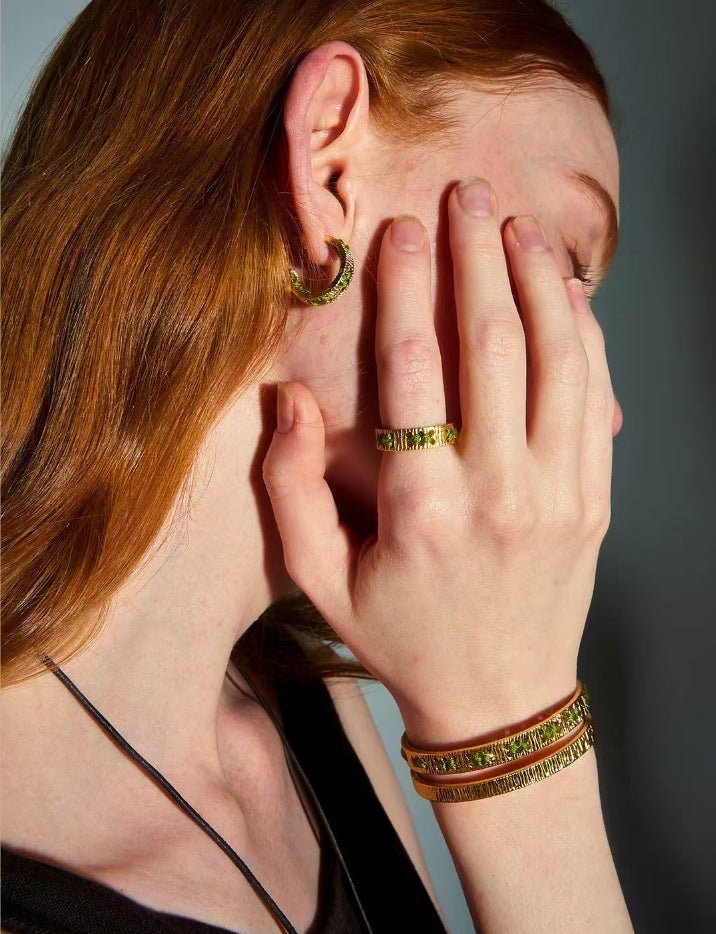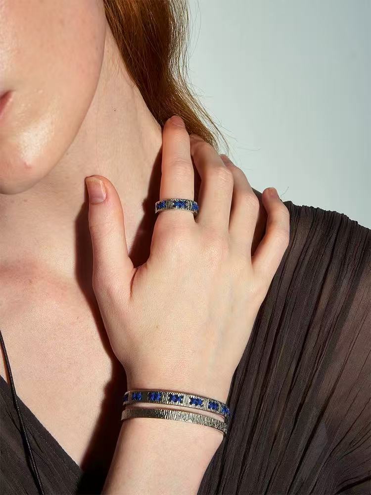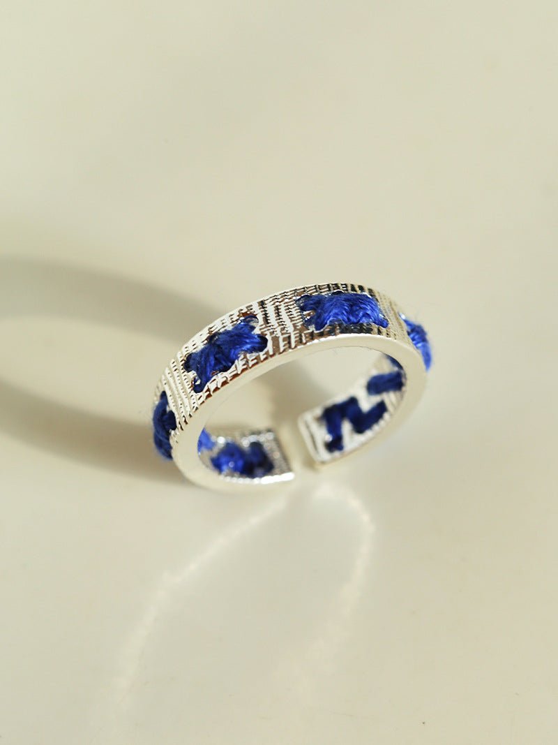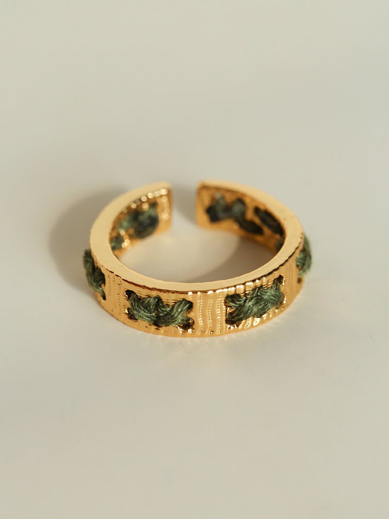 Available in gold or silver tones with green or blue thread accents, the design remains understated yet distinctive.The adjustable open-band structure ensures a comfortable fit, perfect worn alone or paired with the matching cuff bracelet for a relaxed, refined look.