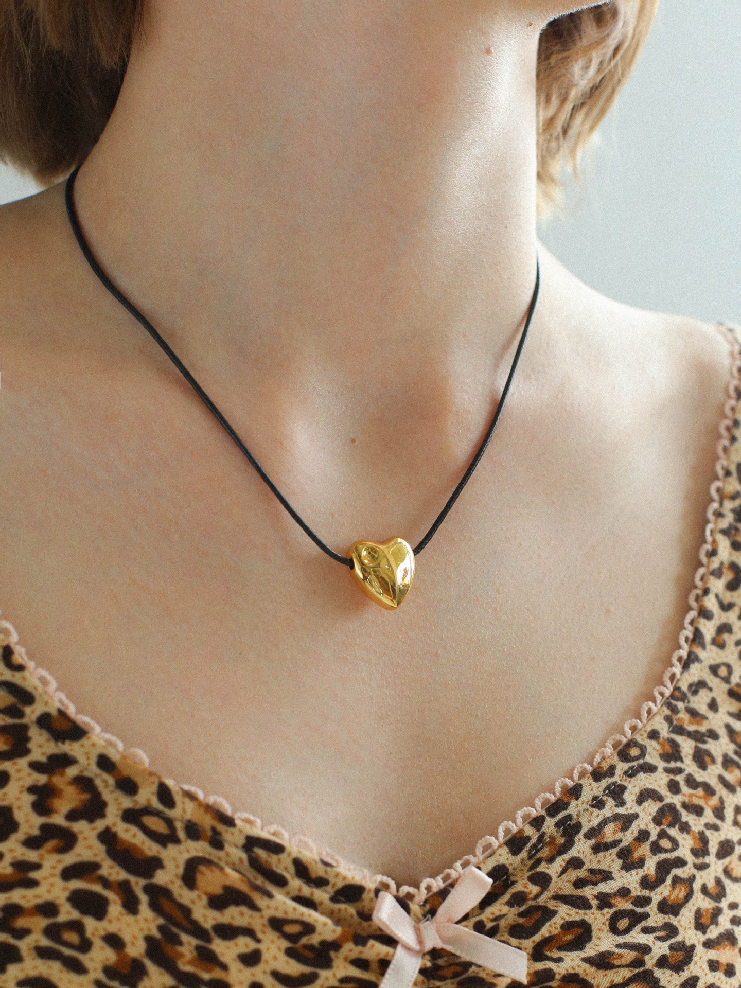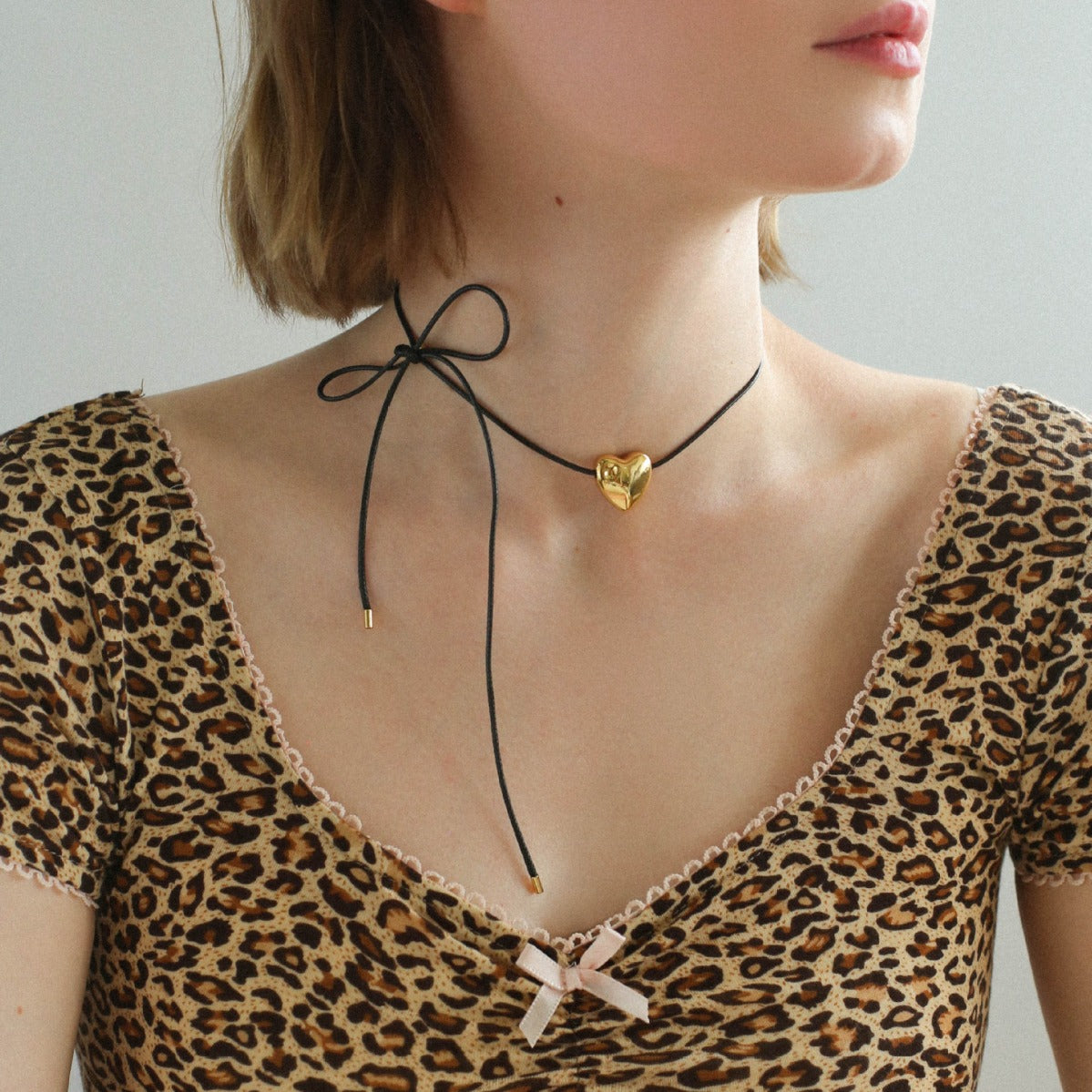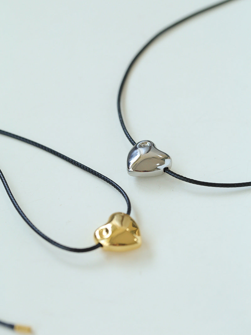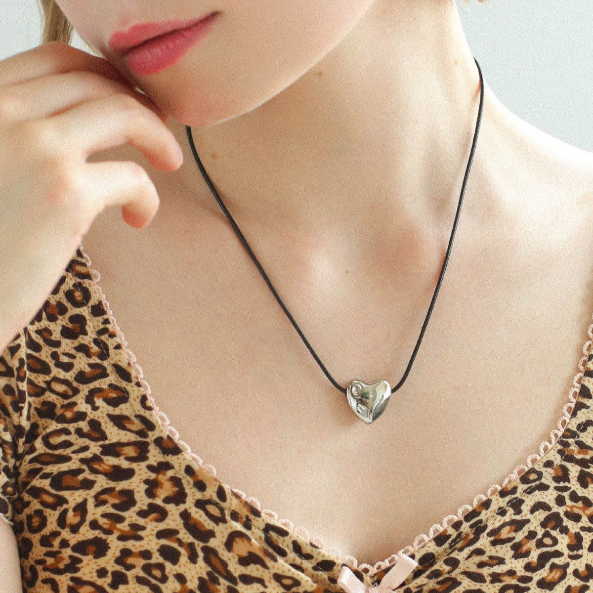 Heart-shaped Black Leather Drawstring Pendant Necklace