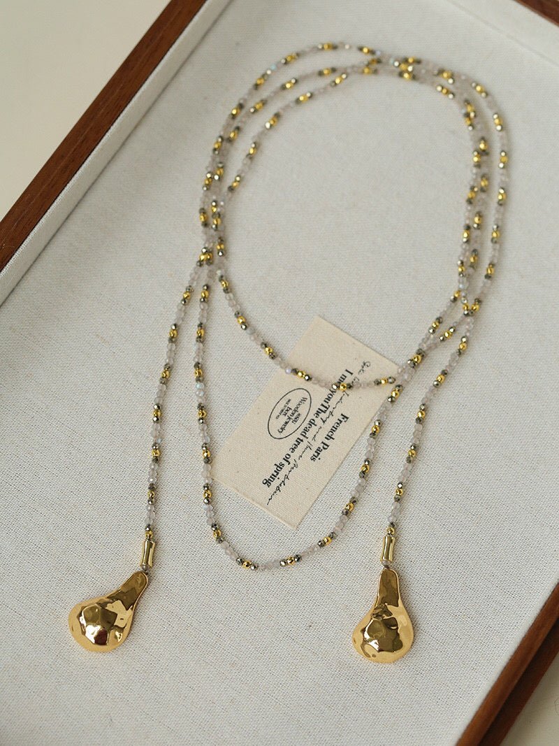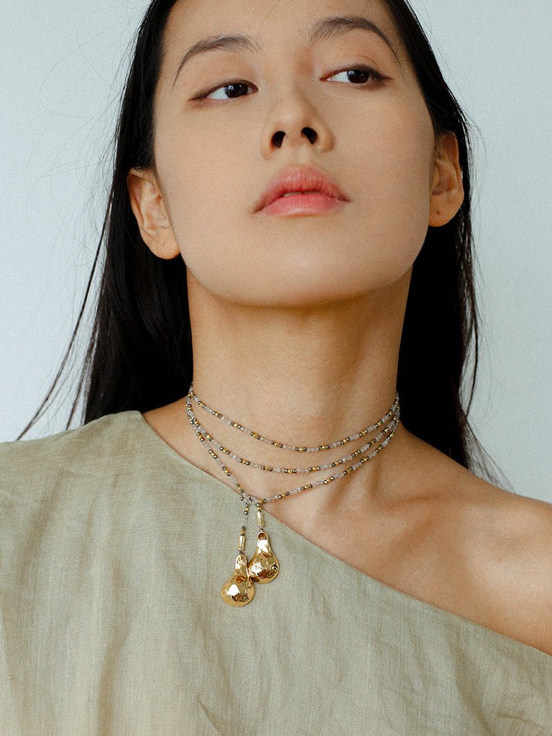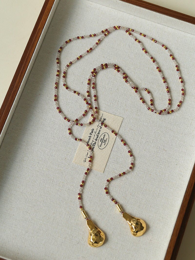 Tiny faceted flash stones sparkle like scattered stardust across your collarbone, while deep garnet beads glow subtly in the light, offering a moody warmth that shifts between quiet luxury and retro romance. Below, two hand-hammered spoon-shaped pendants add a touch of artisan charm and playful individuality.