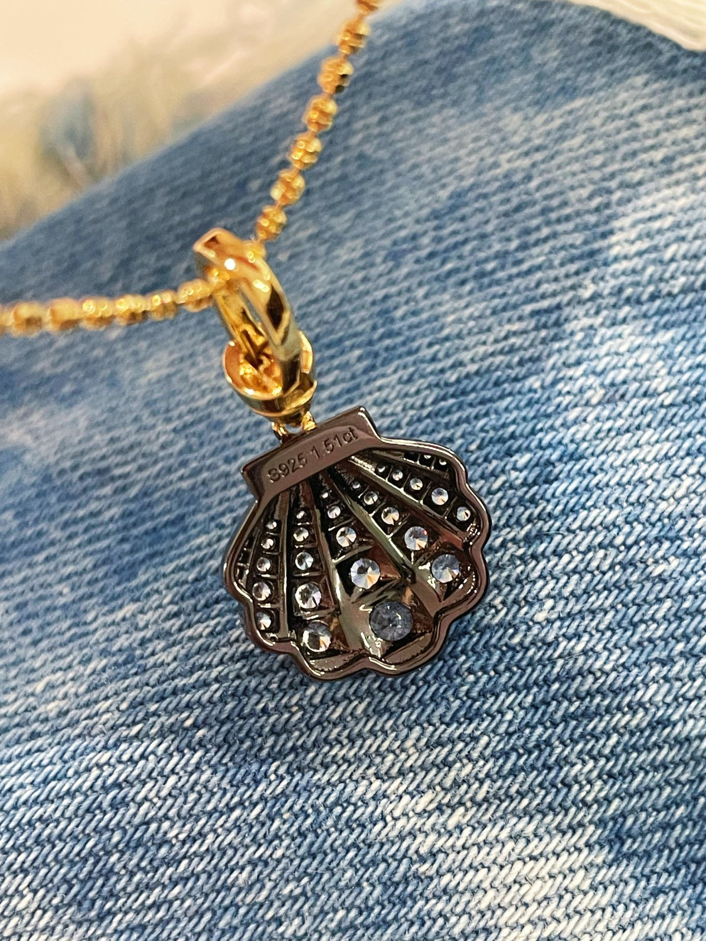 A stunning fusion of elegance and modern design — this black gold shell necklace features a 3D shell pendant adorned with gradient lab-grown diamonds for a captivating sparkle. Crafted in solid S925 sterling silver plated with 18K gold, it offers a luxurious finish and lasting shine. Perfect for elevating both everyday looks and evening outfits.