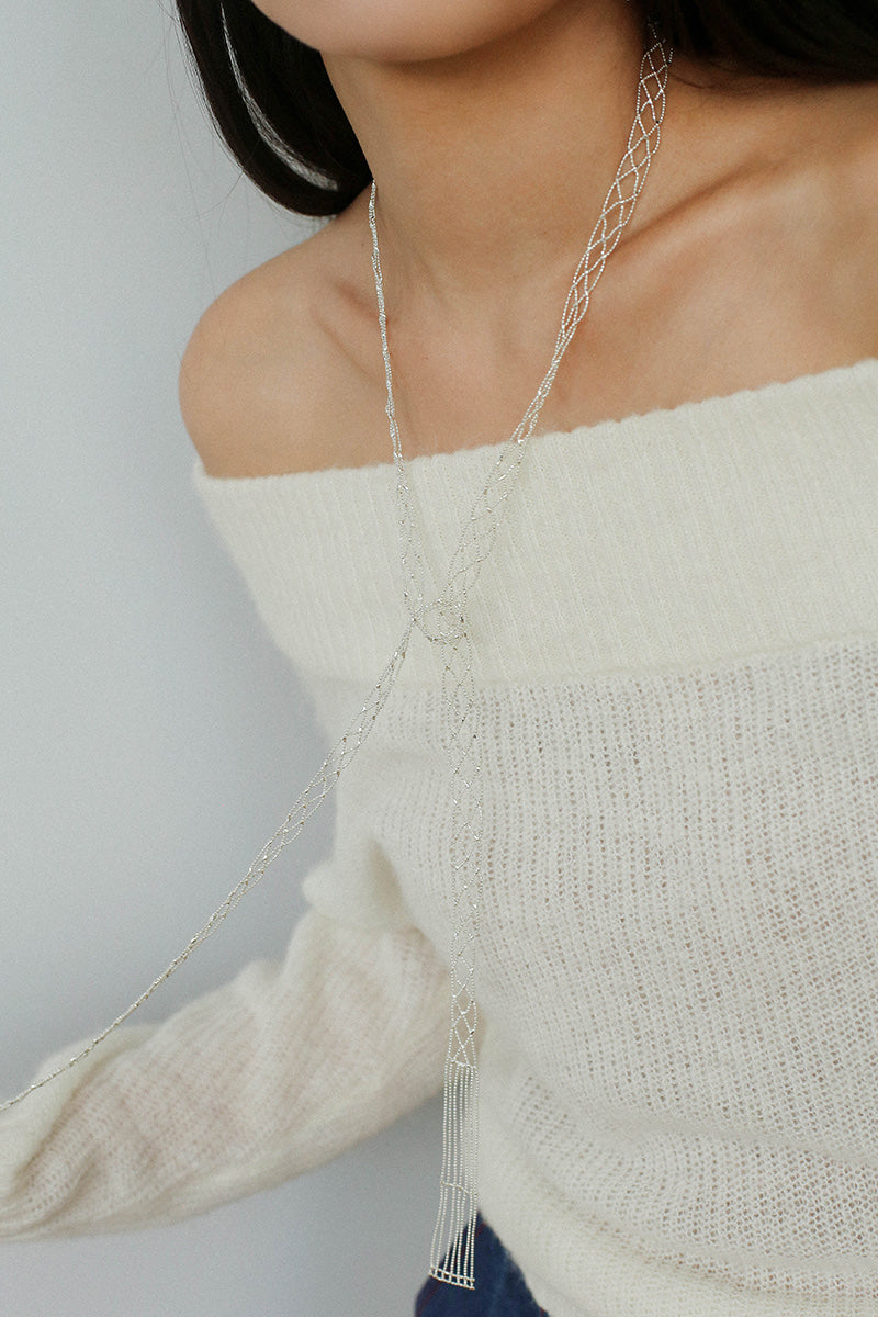 A statement of soft elegance with a modern metallic twist — this lace-inspired long necklace is crafted from woven silver-tone metal chains that drape fluidly like a delicate silk scarf. The open-ended design allows for multiple styling possibilities: