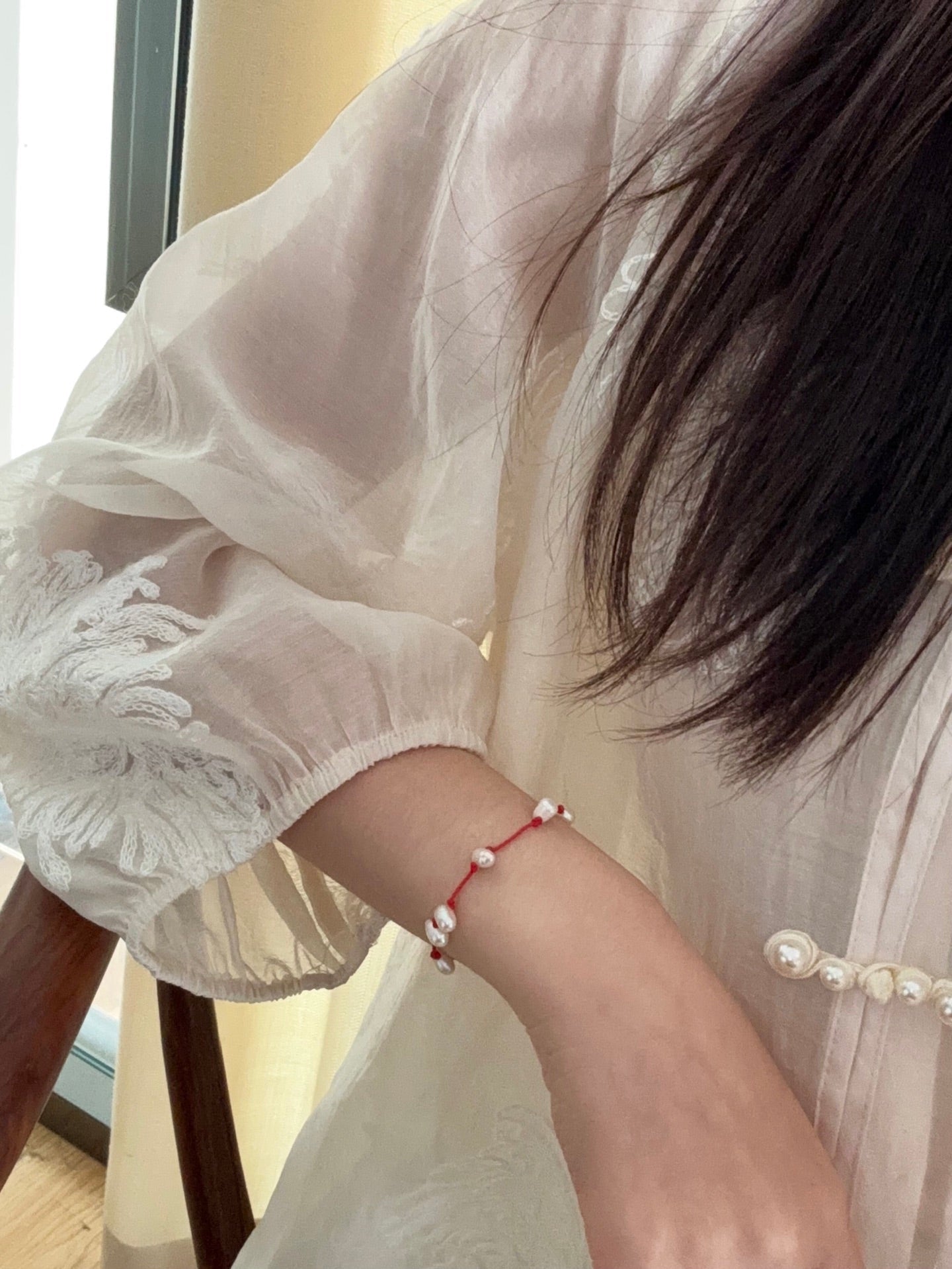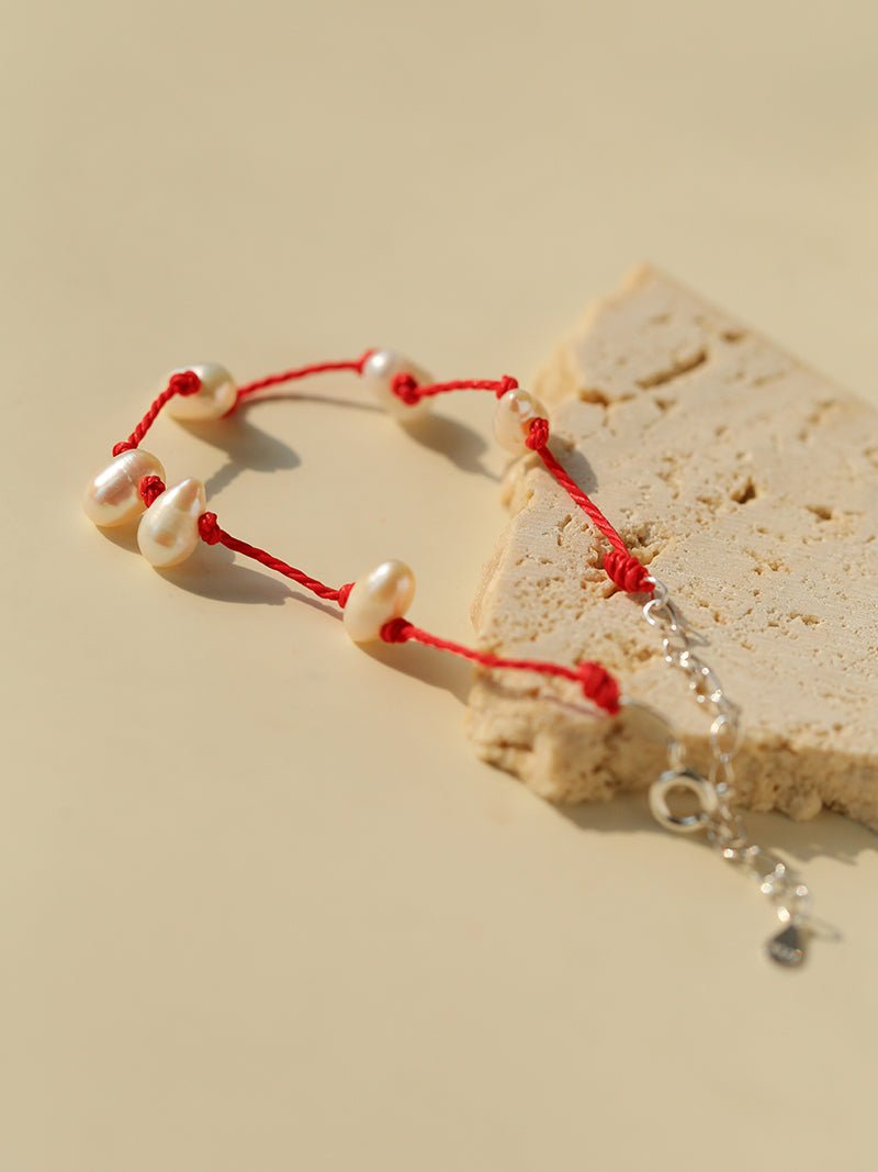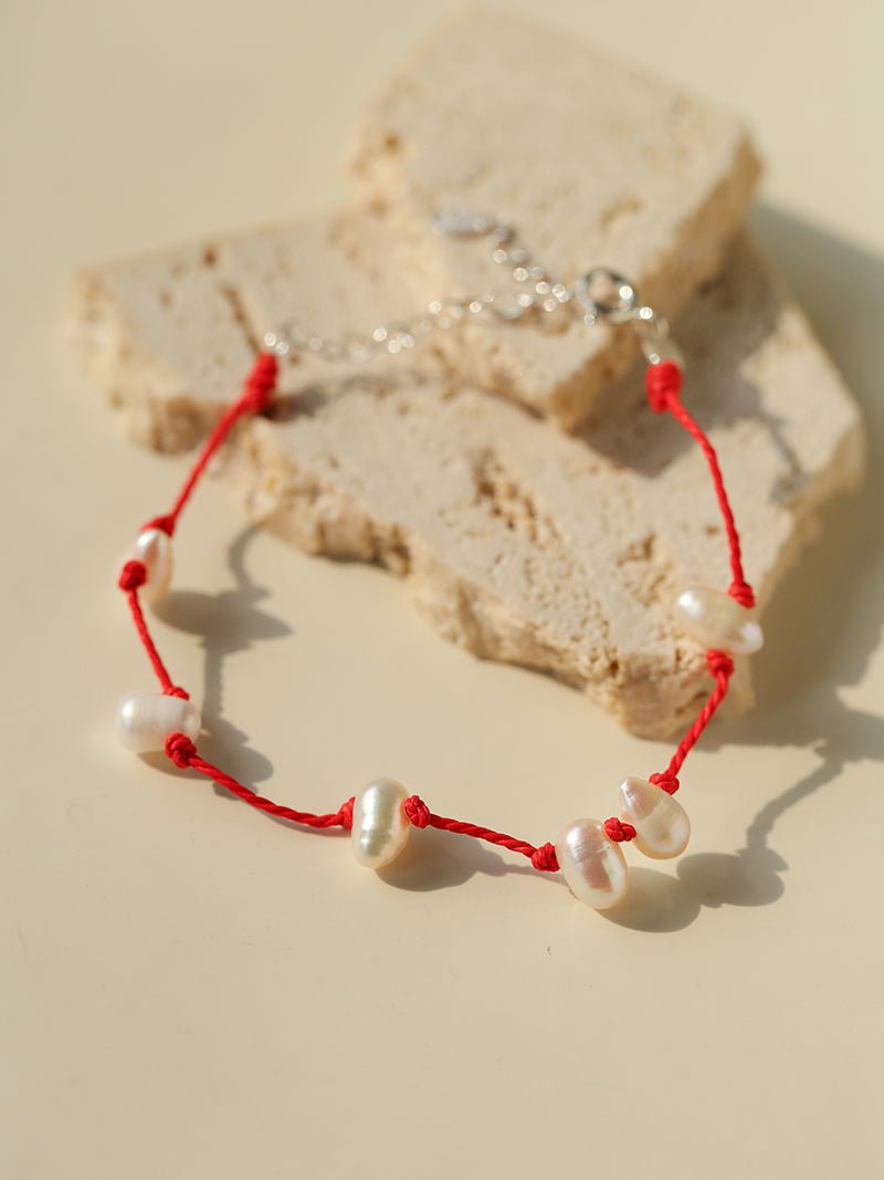 • Pearl Red Cord Bracelet: Handwoven red cord with natural pearls, minimal yet thoughtfully designed, symbolizing good fortune.