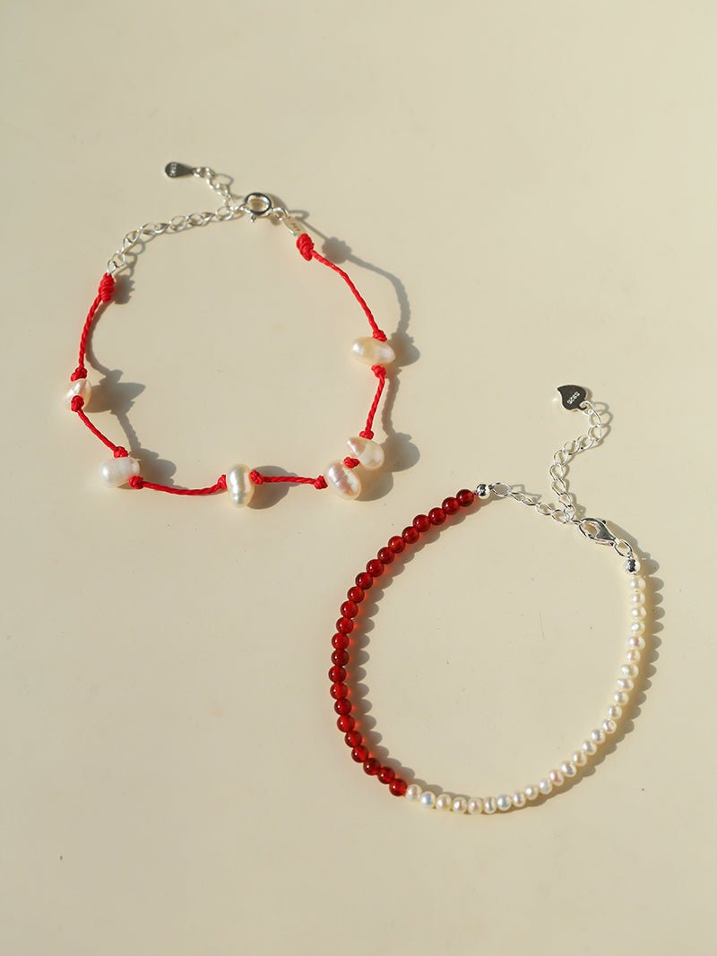 • Pearl & Red Agate Bracelet: A refined combination of red agate and pearls, flattering, elegant, and naturally brightening to the skin tone.