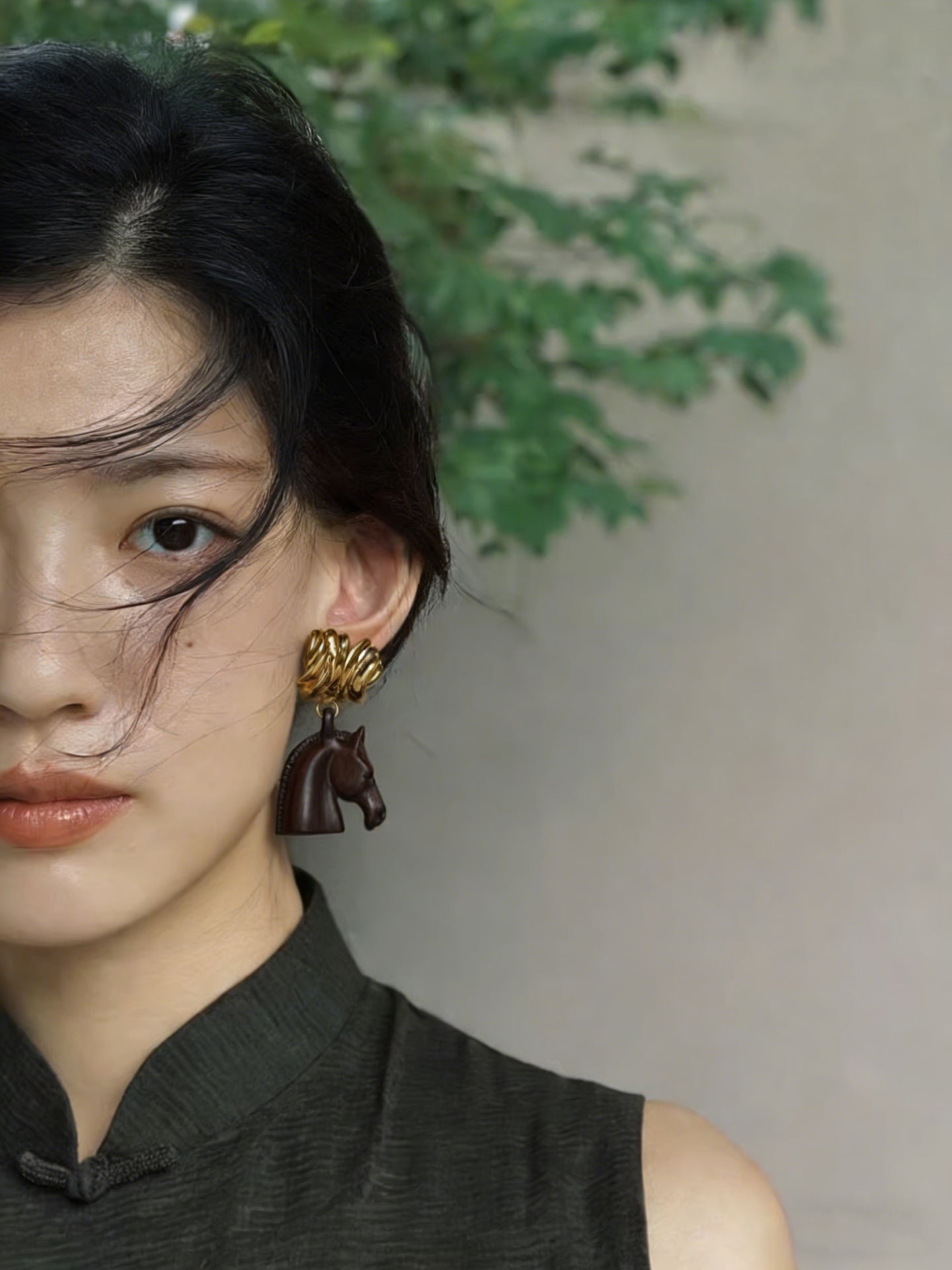 The horse head is hand-carved from natural ebony wood,revealing deep,organic textures that feel raw and timeless. Paired with lava-textured metal elements, the design balances rugged energy with refined craftsmanship.