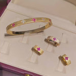These mini clover huggie earrings are delicately crafted by hand, featuring rich rubies and sparkling accent stones in a refined, understated size perfect for everyday wear.