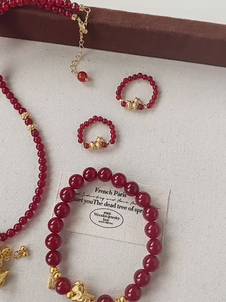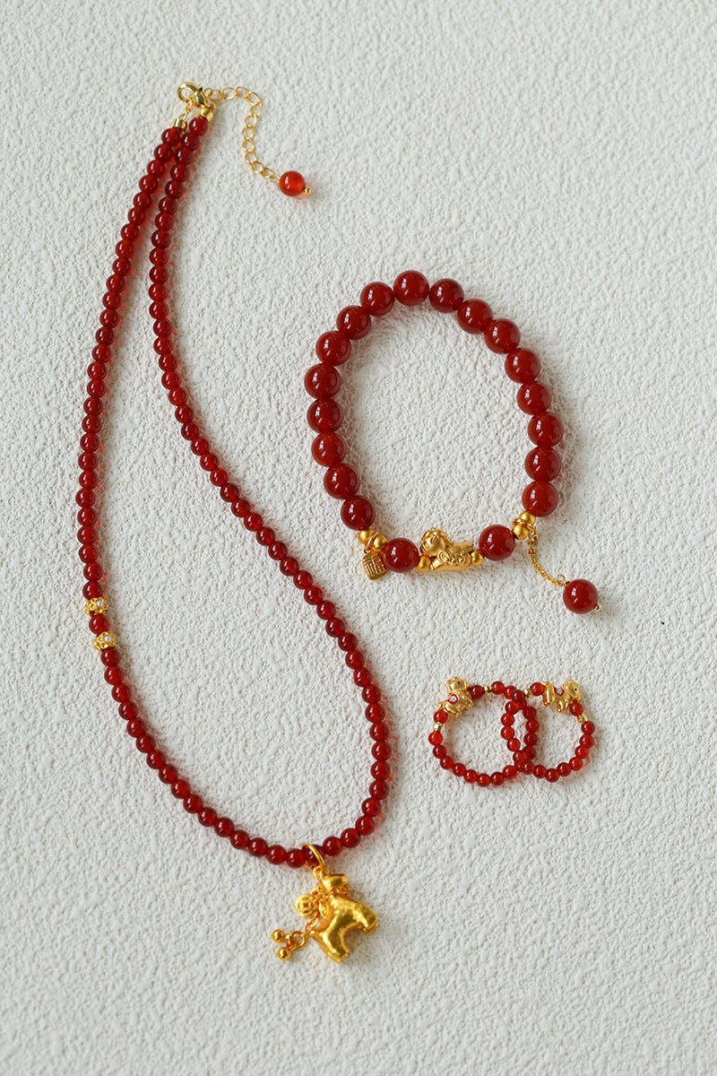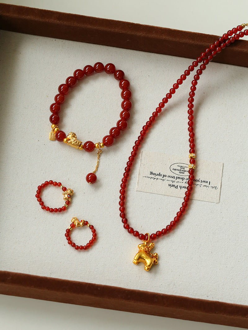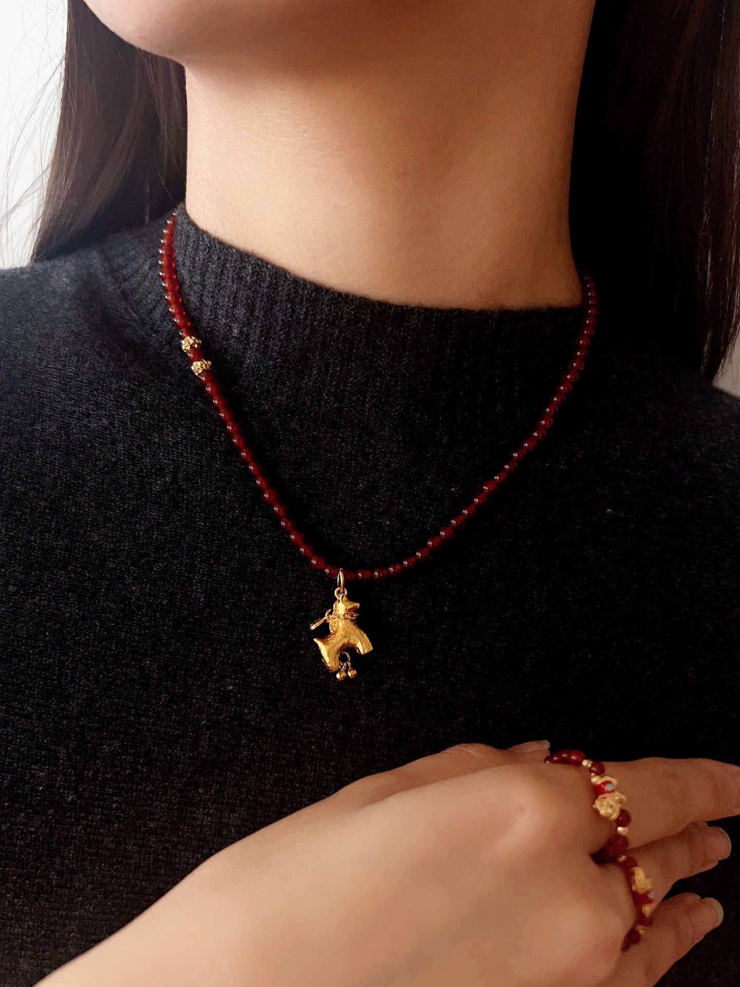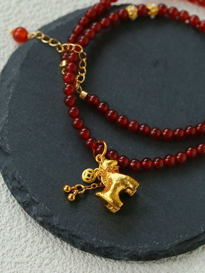 Celebrate the Year of the Horse with this exquisite Red Agate necklace featuring a gold-tone horse pendant.Each red agate bead is smooth and lustrous, while the horse charm showcases intricate craftsmanship with a matte antique gold finish, adding elegance and charm.