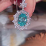 Dazzling and bold, this rose-cut Paraiba pendant necklace is a true showstopper. The center stone — a luminous, high-clarity lab-created Paraiba — radiates vivid brilliance and an enchanting fluorescent glow. Surrounded by a halo of pavé-set diamonds in a fine jewelry-level cluster setting, it brings undeniable elegance and presence.