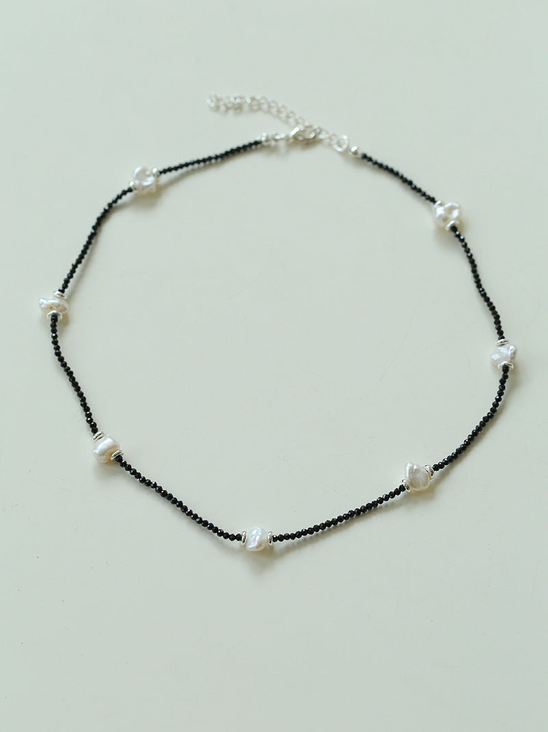 Small Petal Baroque Pearl and Black Spinel Beaded Necklace - floysun