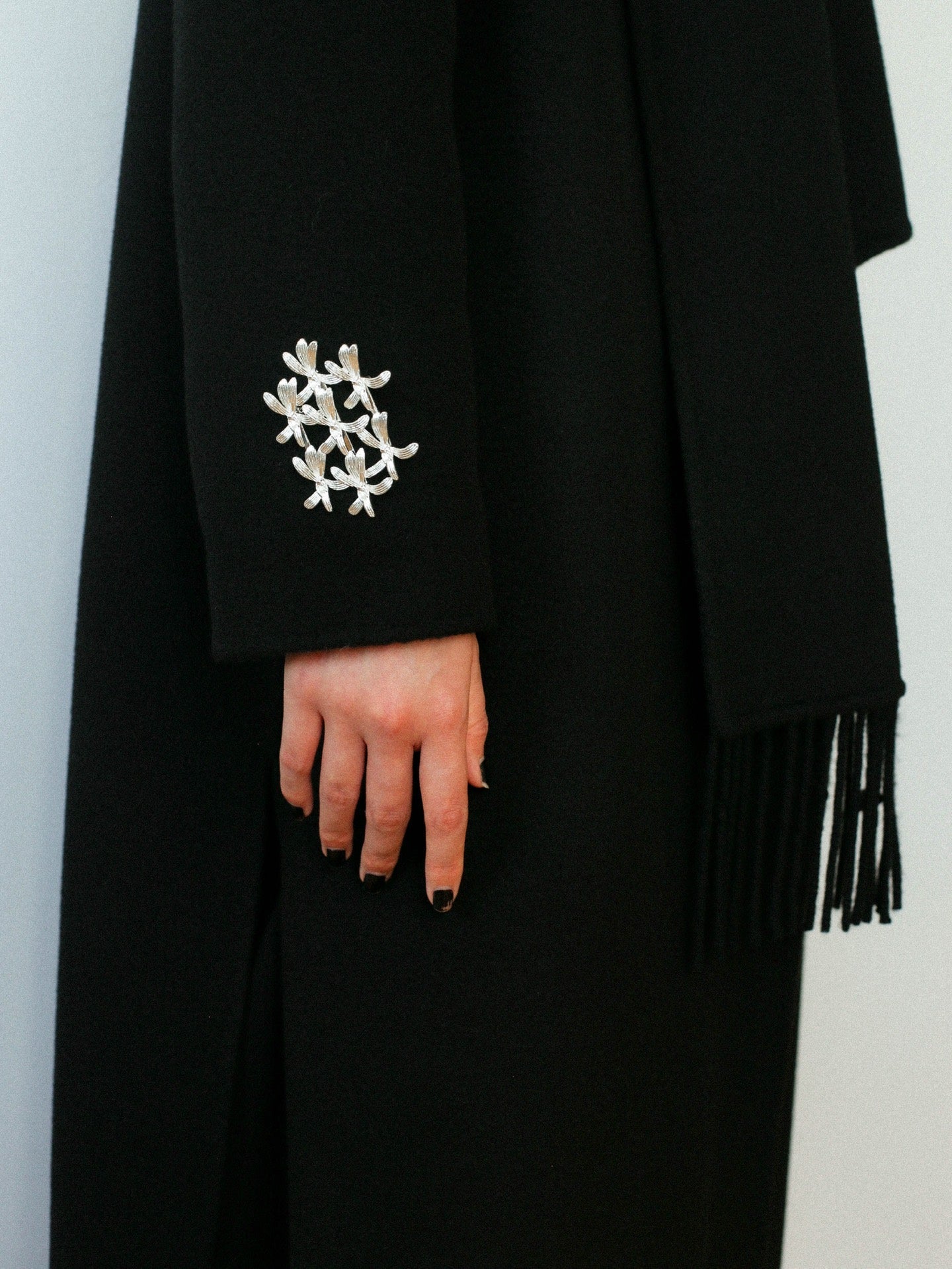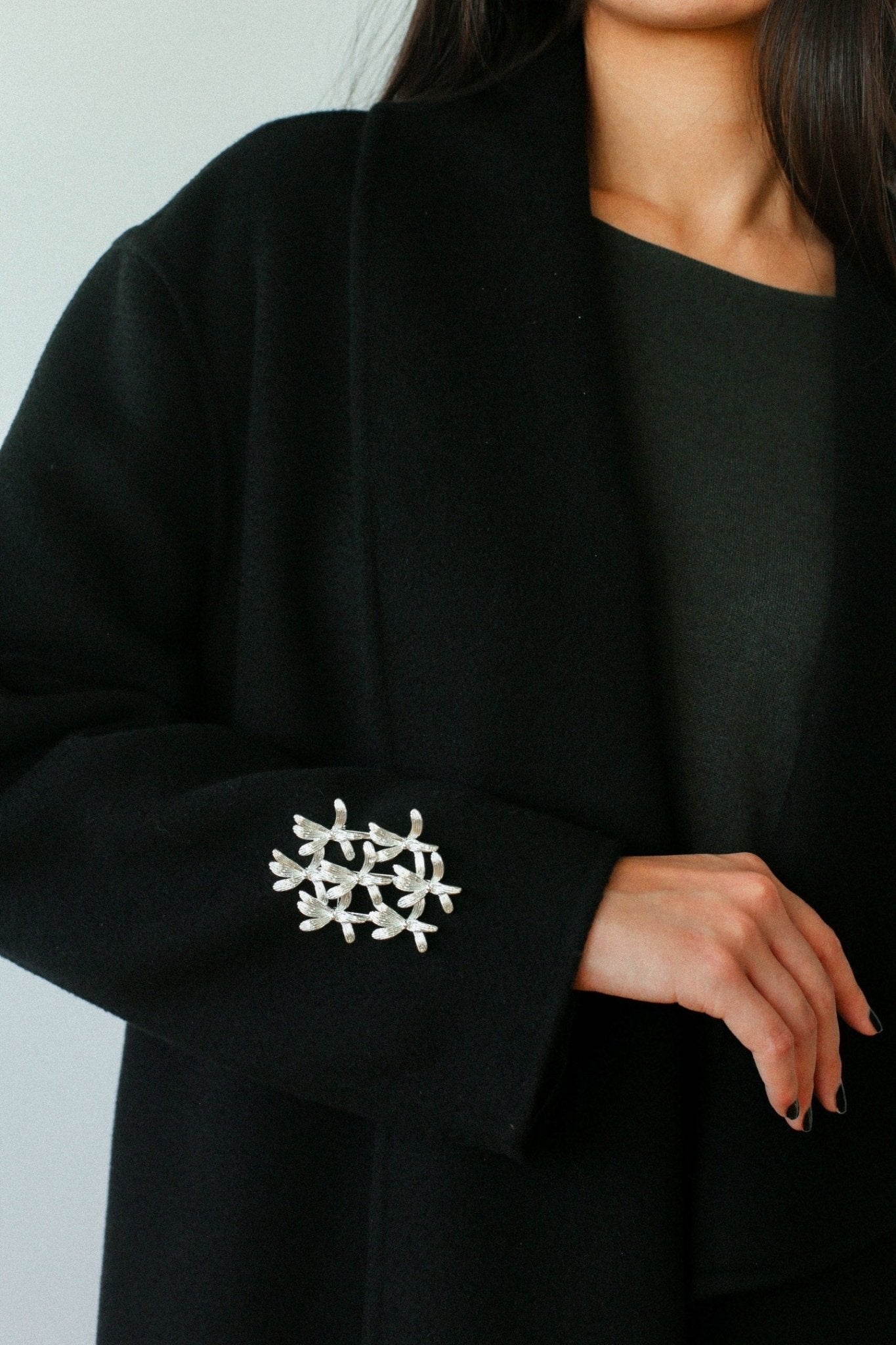 Its cool silver finish contrasts beautifully with soft fabrics, creating a subtle yet eye-catching accent. Perfect for workwear, coats, dresses, or scarves, this versatile accessory enhances both everyday and special-occasion outfits, adding a refined, small-batch design aesthetic.
