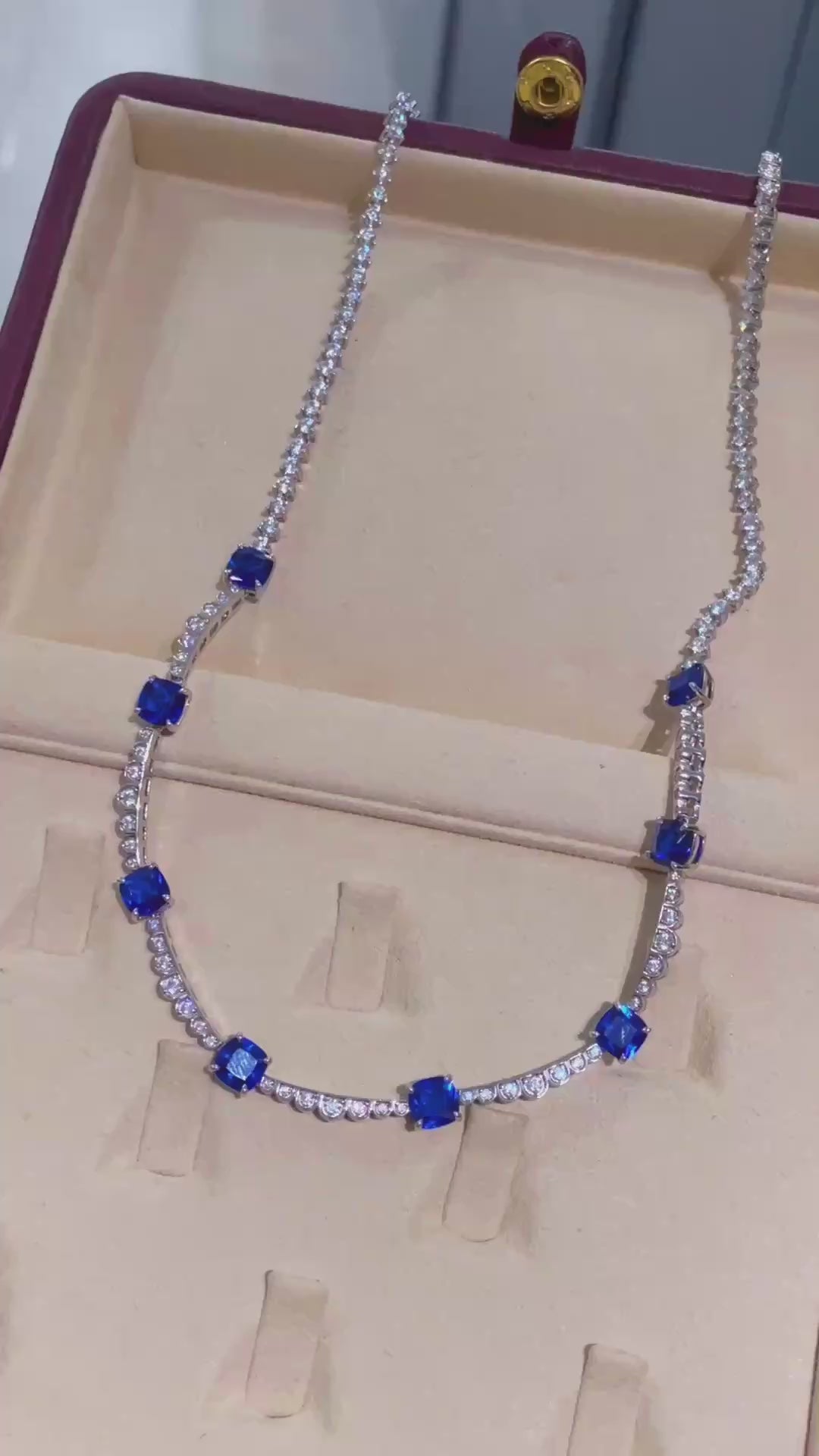 Elegant, modern, and exceptionally flattering — this choker necklace is designed to shine on the neckline. Featuring small sugar-cut royal blue sapphires accented with delicate diamond spacers, the piece brings a refined rhythm and elevated fashion appeal.