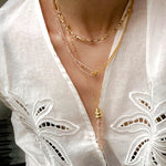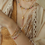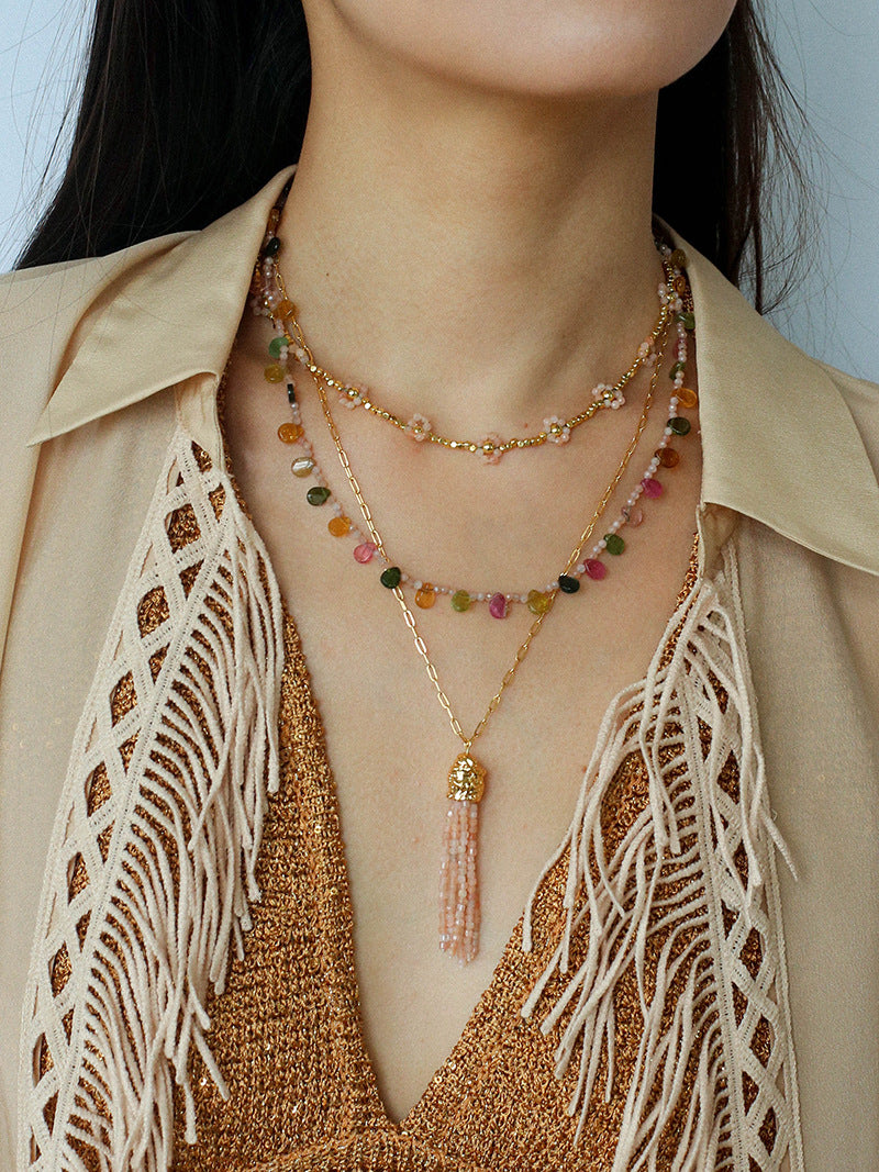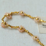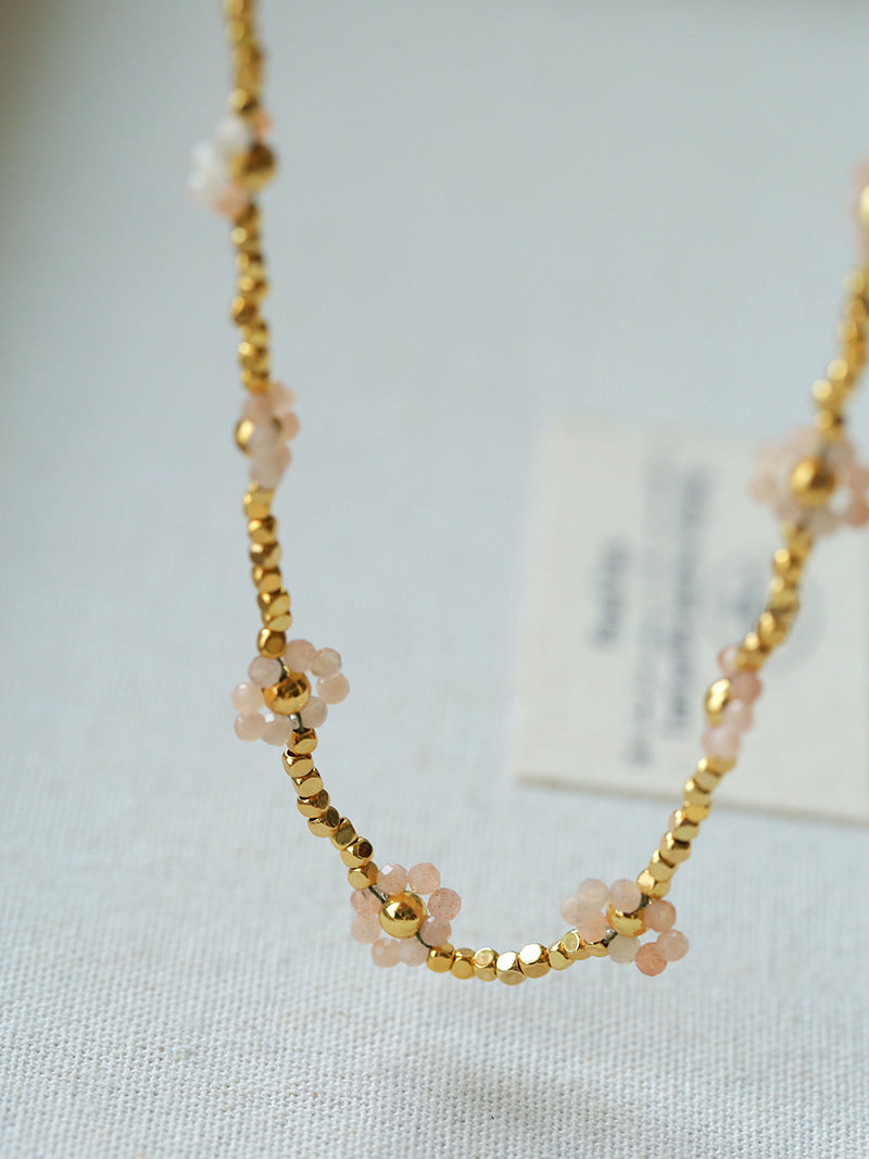 Tiny gold cube beads shimmer subtly, while delicate sunstone flowers add a gentle orange-pink glow that catches the light beautifully. Simple yet refined — perfect for daily wear, dates, or layering with other pieces for a more romantic, elegant look.