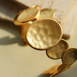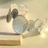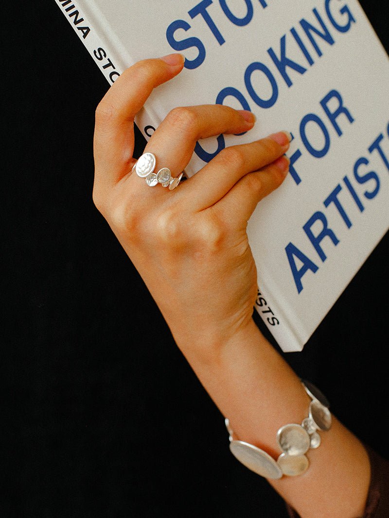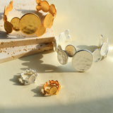 Inspired by the flowing rhythms of nature, the Fluid Rhythm Stacking Bangle & Ring Set breaks away from traditional symmetry, using irregularly sized circular elements stacked and colliding to express the boundary between freedom and art. The gold version is crafted with a genuine gold electroplating process, where the irregular rings reflect a luxurious metallic shine, reminiscent of the fiery glow of a setting sun. The cool silver tone, paired with matte and textured surfaces, evokes the scattered fragments of stars, exuding a modern minimalist vibe with an air of refined detachment.