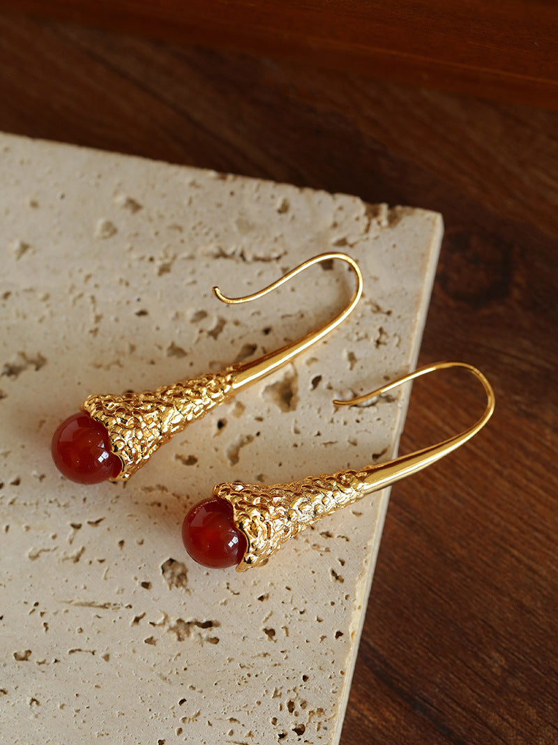 Gilded Bud Red Agate Drop Hook Earrings