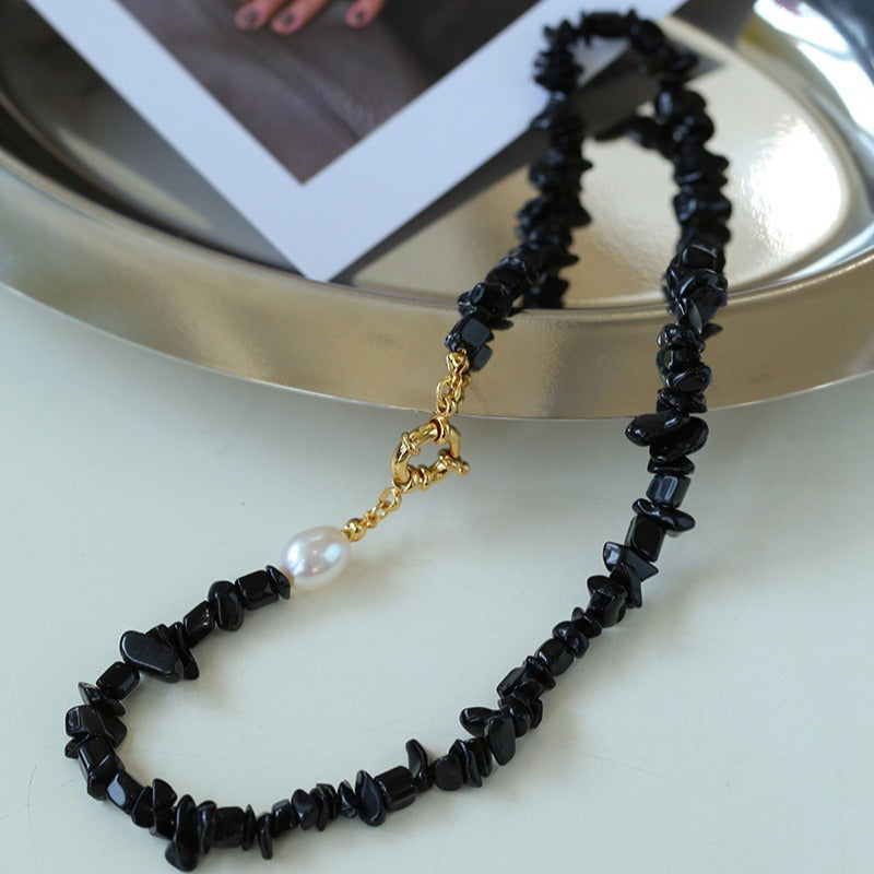 Brilliant Black Onyx Crushed Stone and Pearl Necklace - floysun