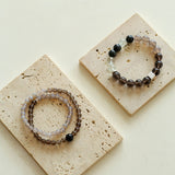 A statement double-layer bracelet that blends earthy elegance with energetic strength. Featuring smoky quartz, gray agate, white quartz, and black agate, this piece is adorned with sterling silver details for a touch of sophistication.