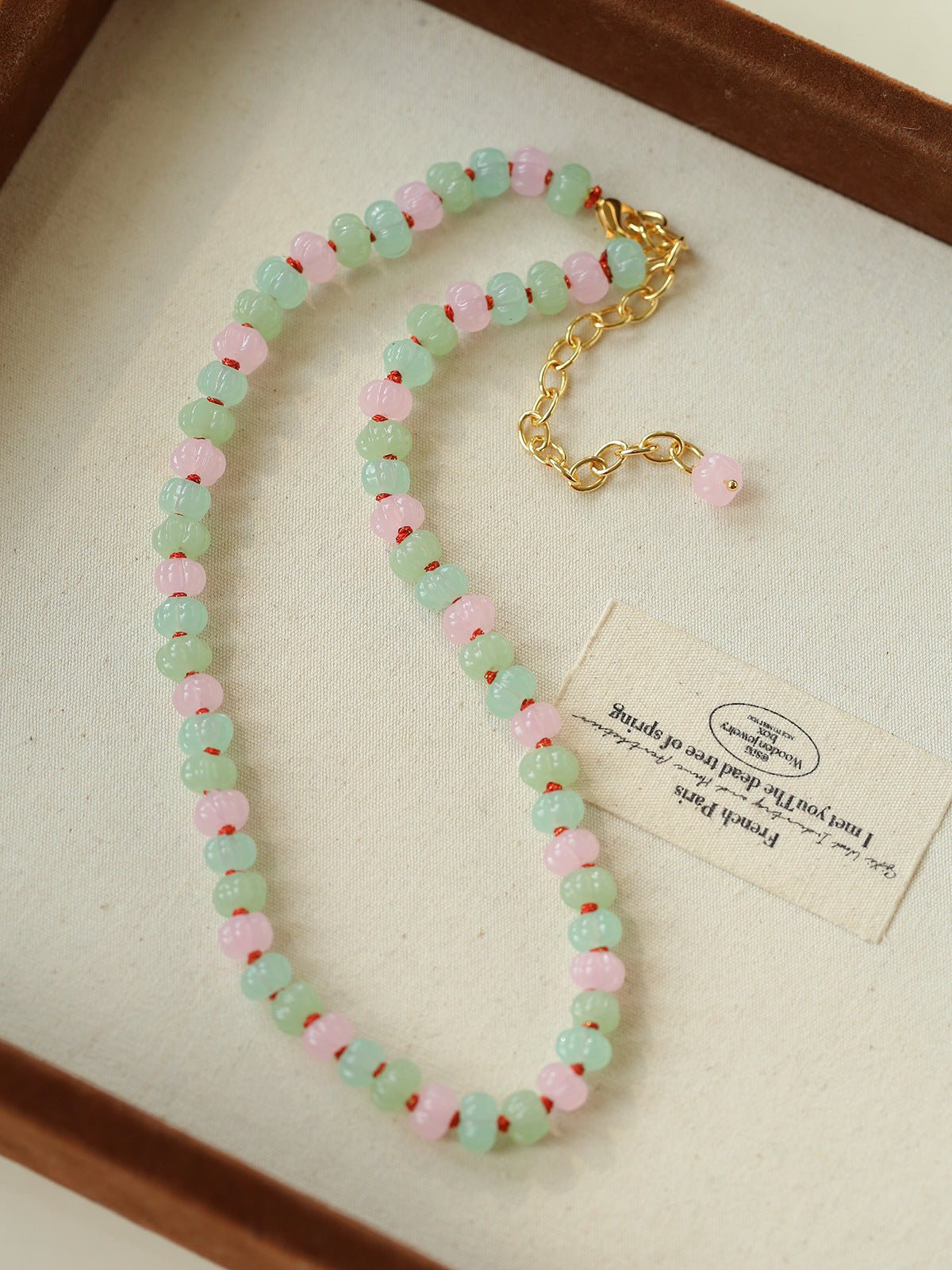 This natural stone necklace features soft pink and green lantern-shaped beads, bringing a subtle oriental charm to modern styling.