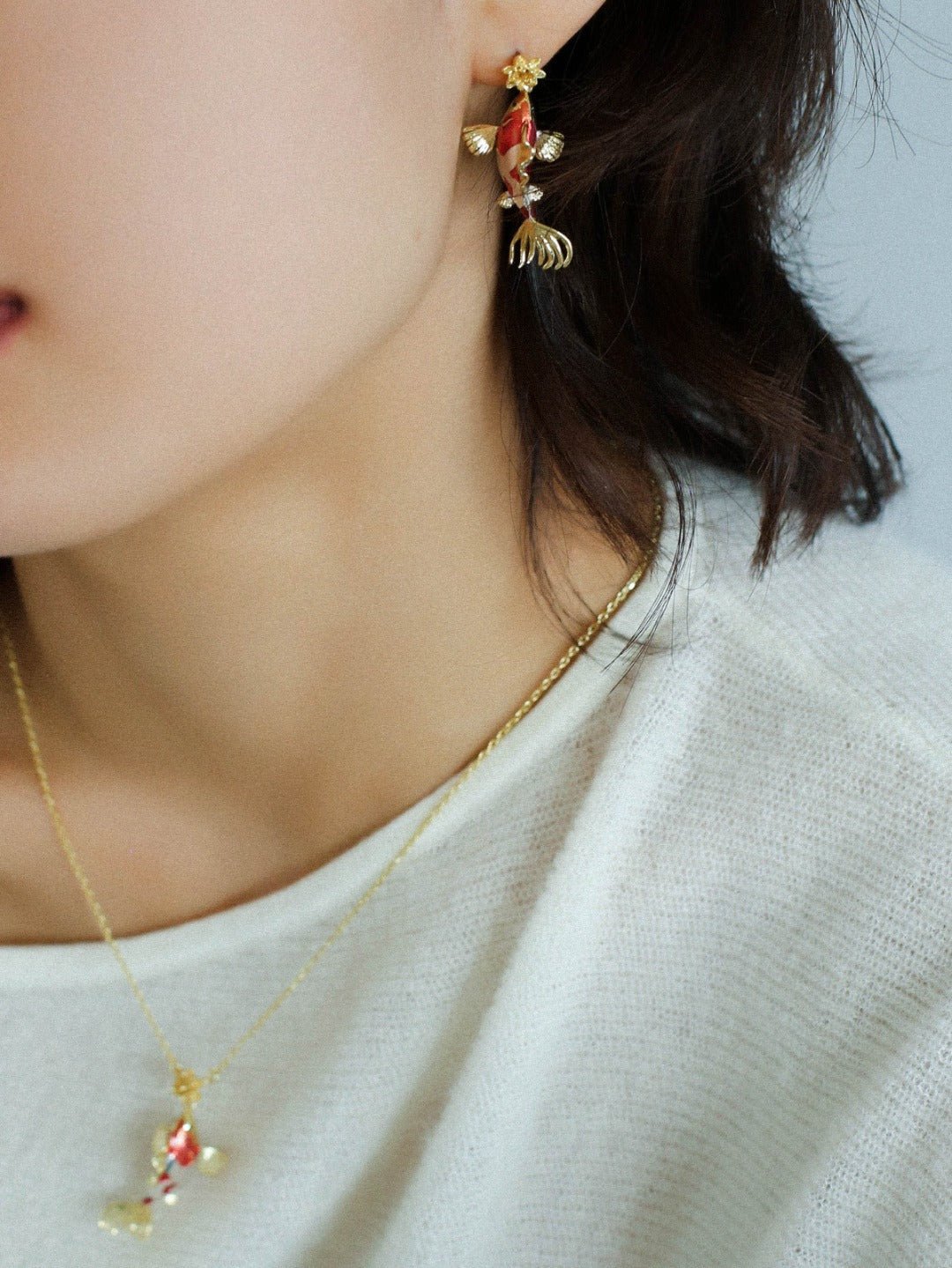 Celebrate the New Year with handcrafted luck and charm! This set features vivid enamel koi fish pendants and earrings, accented with red spinel stones. Each fish is delicately carved, capturing the intricate scales and fins for a lifelike, playful look.